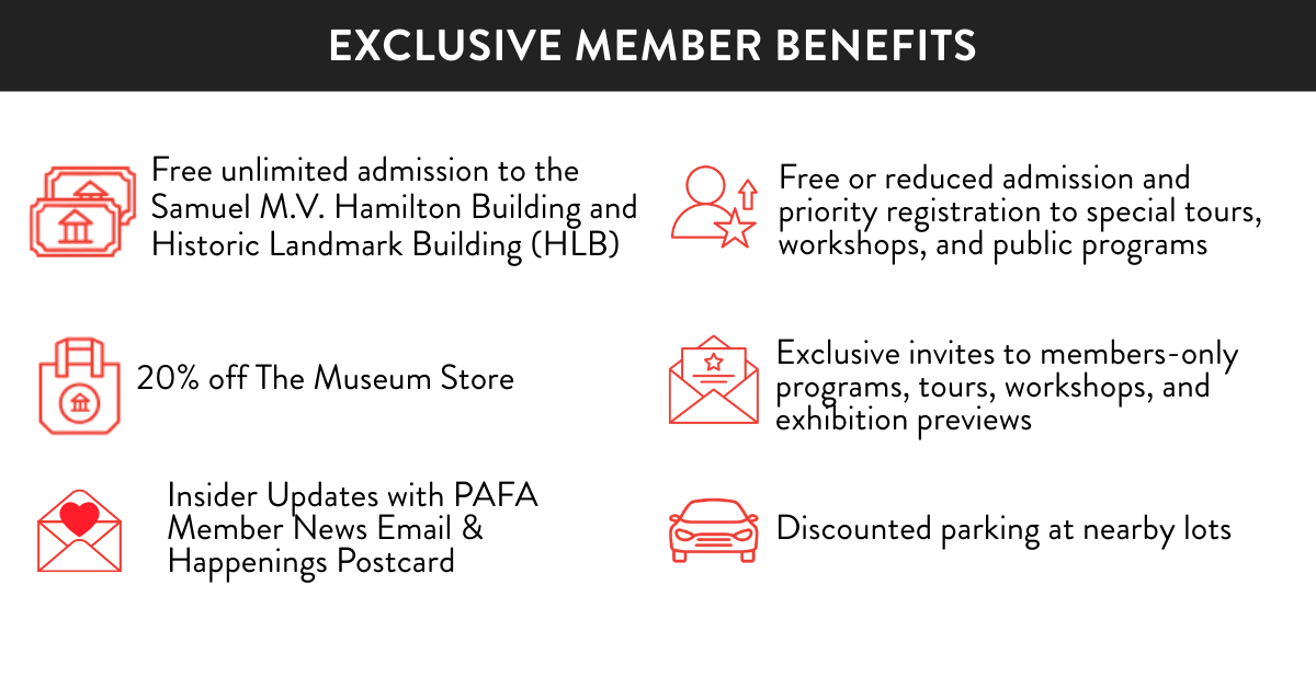 PAFA members enjoy complimentary admission, exclusive member programming and events, plus discounts on Museum Store purchases, Continuing Education classes, Summer Art Camp, and more.