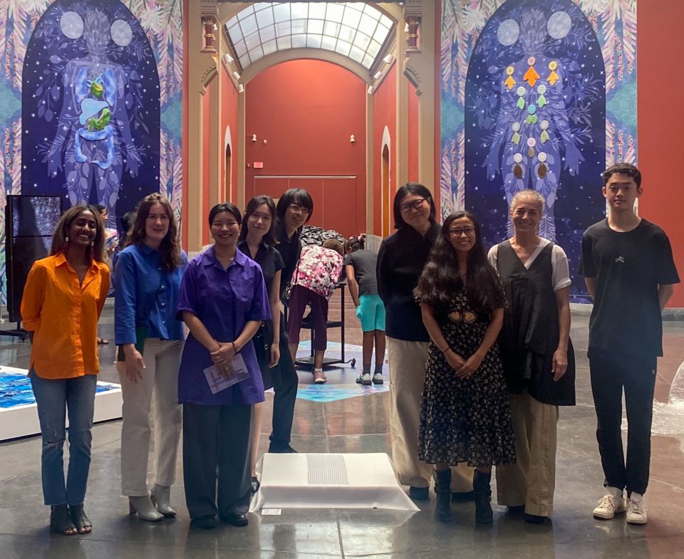 Image: Class with Saya Woolfalk's We Emerge at the Sunset of Your Ideology, 2022, Multimedia installation, 4 figures: glass and digital collage vinyl mural, 214 in. x 145 in. each. 2 single-channel color videos, infinite loop with sound. Commissioned by PAFA for Rising Sun: Artists in an Uncertain America, courtesy Leslie Tonkonow Artworks + Projects