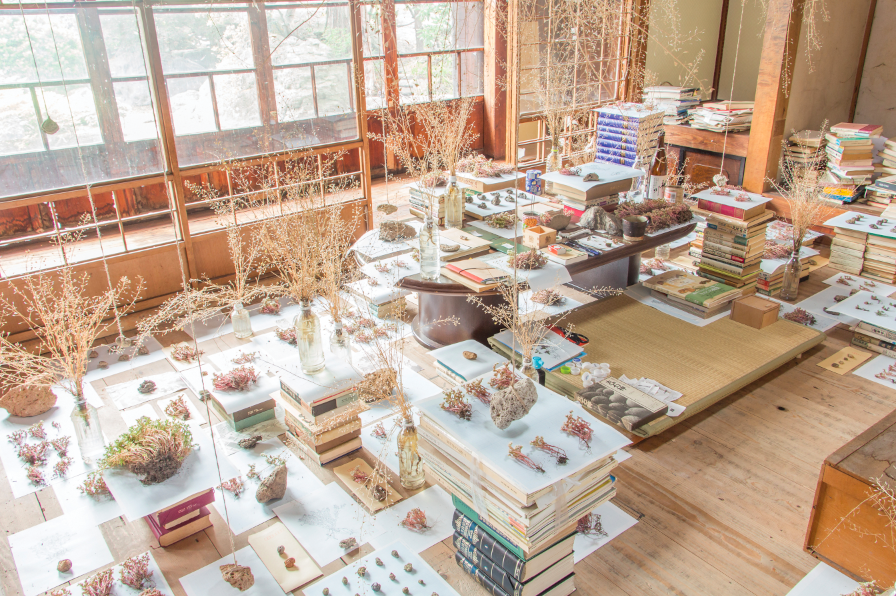 Image Information: A Wide Area Where Three Rivers Gather, 2018, Mixed media installation, sedum weeds, volcanic minerals, ink on paper, books, 11.5 L x 8.5 W x 9H ft (7 x 3,5 x 2,7 m), Maruseppu, Hokkaido, Japan