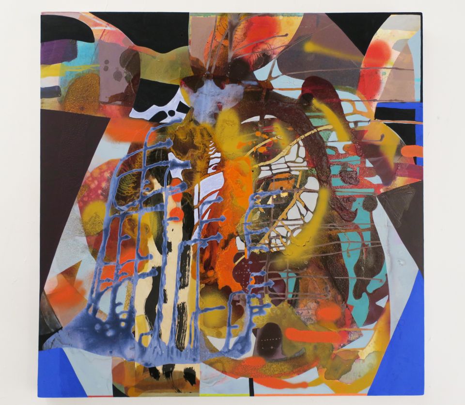 Image Information: "Here", acrylic, shellac, gouache and spray paint on canvas, 36"x 36", 2021