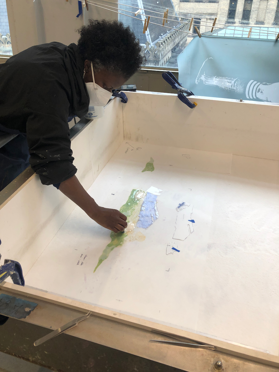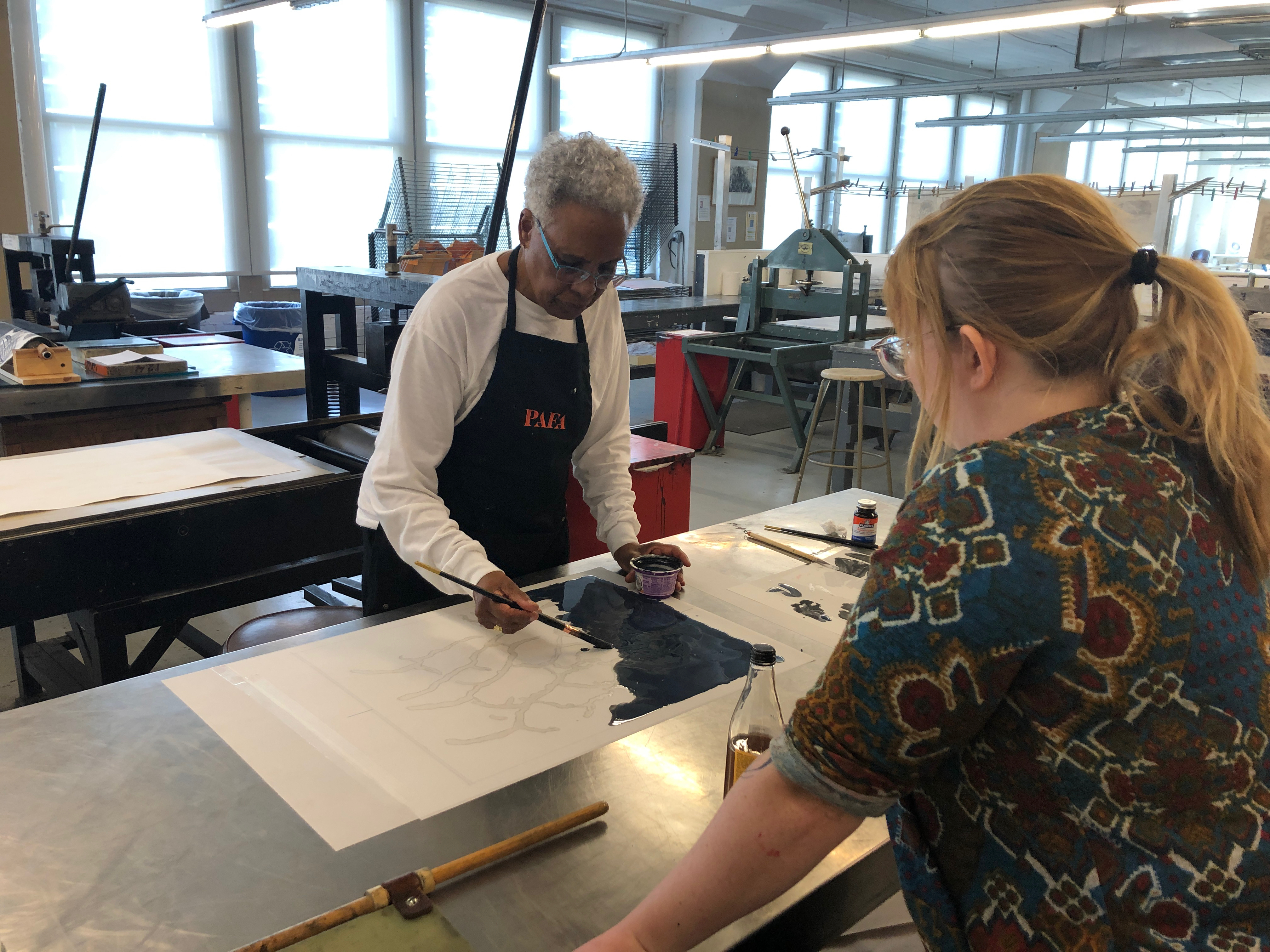 Image: Artist Kukuli Velarde in residence at the Brodsky Center at PAFA, December 2022, working on her new edition to be published in April 2023.
