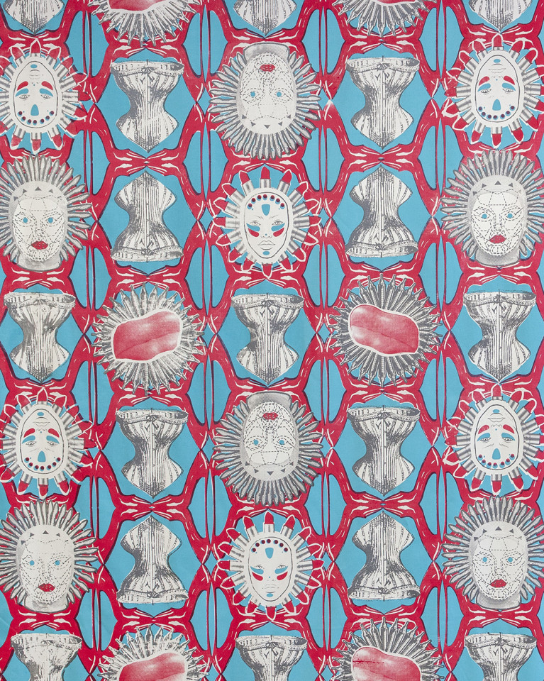 Featured Image: Heather Raquel Phillips, Nip, Tuck, Paint, Pluck, 2022, multicolored repeat screen print on bleached cotton yardage. Photo credit: Carlos Avendaño, courtesy of The Fabric Workshop and Museum.
