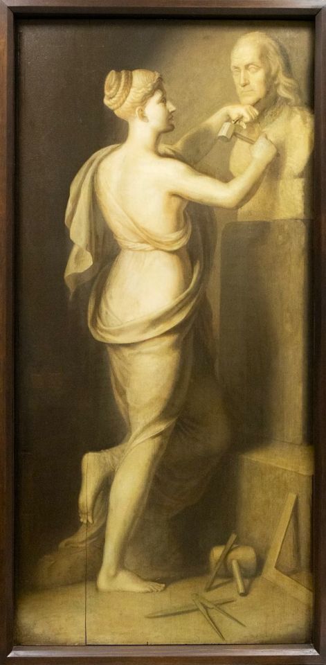 Image: Rembrandt Peale, Sculpture, almost life-size grisaille painting of a Grecian woman sculptor at work, with bust of Benjamin Franklin. Atwater Kent Collection at Drexel. Photo by Michael Shepherd.