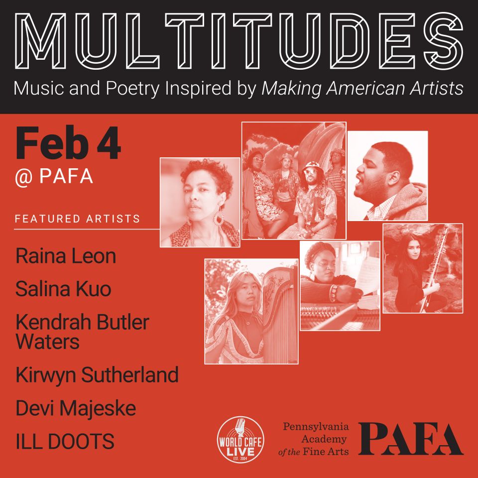 World Cafe Live and the Pennsylvania Academy of the Fine Arts (PAFA) present Multitudes, a multisensory event series. Hear world premiere works from some of Philadelphia’s top performers commissioned by World Cafe Live, all inspired by PAFA’s current exhibition, Making American Artists: Stories from PAFA 1776 - 1976.