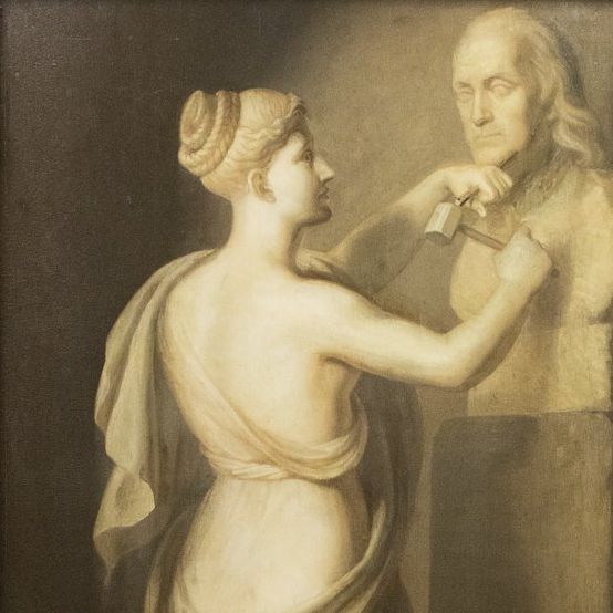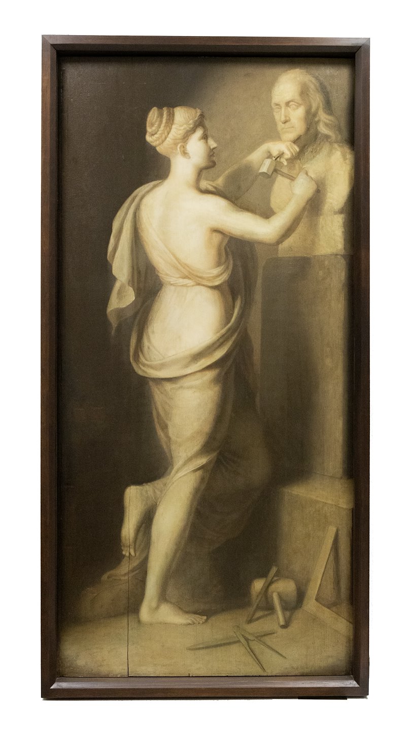 Featured Image: ‘Sculpture’ Almost life-size grisaille painting of a Grecian woman sculptor at work, with bust of Benjamin Franklin. By Rembrandt Peale. Atwater Kent Collection at Drexel. Photo by Michael Shepherd.