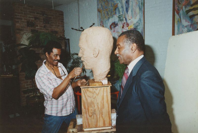 Image: Color photograph of Fred Shuttlesworth modeling for John Rhoden during a sculpting session, 1991-92. John Rhoden Papers.