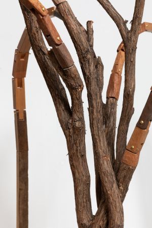 Featured Image: Ward, detail, 2024, juniper, pine boards, various types of finished wood, glue, screws, nuts, stain, 83 x 64 x 50 in., photo by JMay Studio.