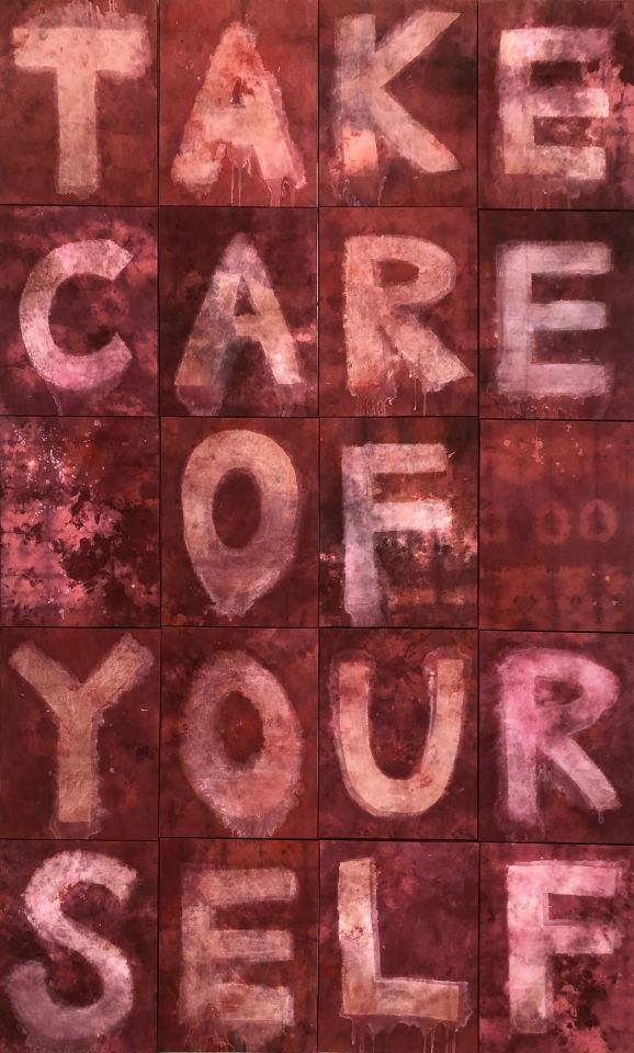 Image information: Take Care of Yourself, 2022, stencil print on hand dyed fabric (bleach and white ink), 120" x 72".