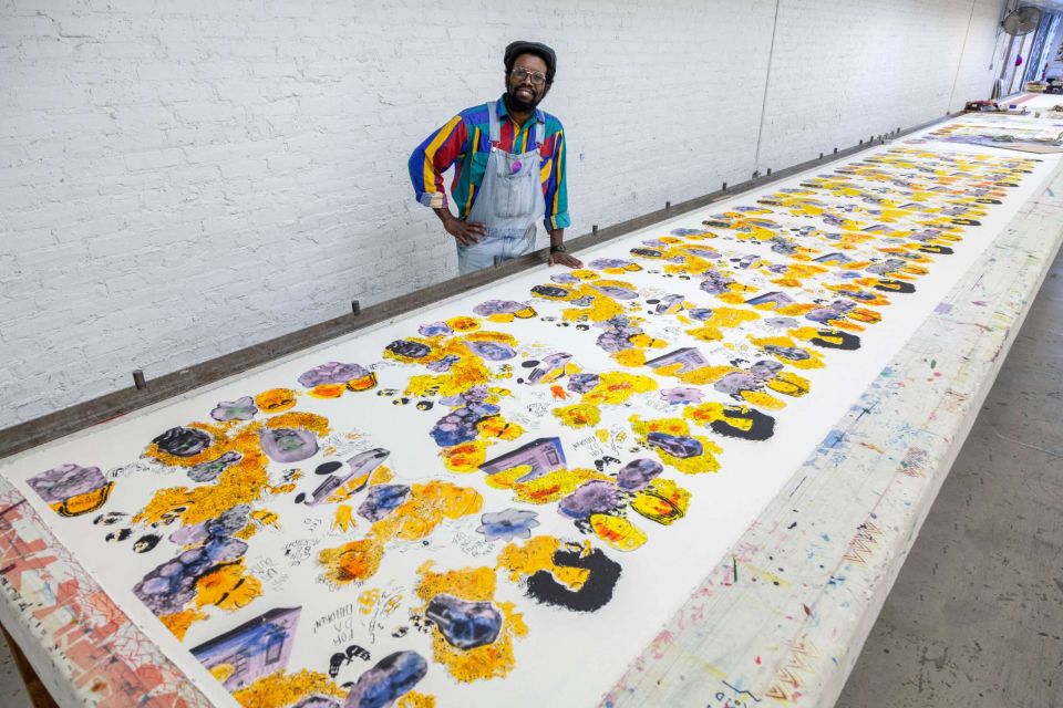 Featured Image: Joshua Washington, "The Streets Gave Me a Crown", 2023, multicolored repeat screen print on unbleached cotton yardage; photo taken during the Apprentice Program at the Fabric Workshop and Museum.
