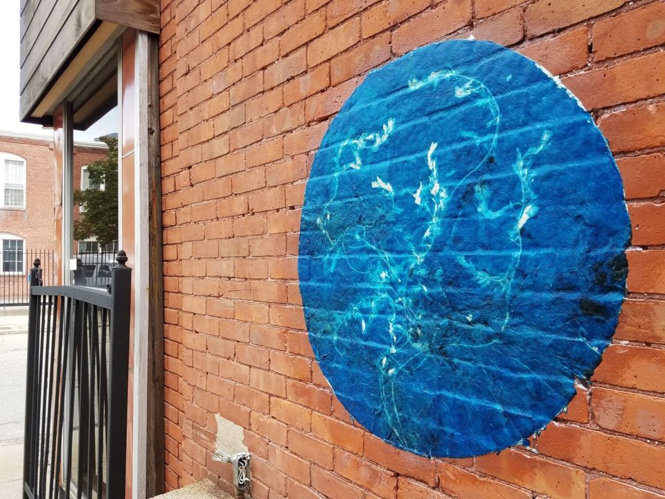 Image: May Babcock, Blackstone Watershed Papers, 2018, wheat-pasted cyanotype on artist-made paper from water chestnut (Trapa natans), Japanese knotweed (Fallopia japonica), Eurasian milfoil (Myriophyllum spicatum), cotton waste scrap, abaca, 36 inches in diameter. Image courtesy of the artist, © 2022 May Babcock.