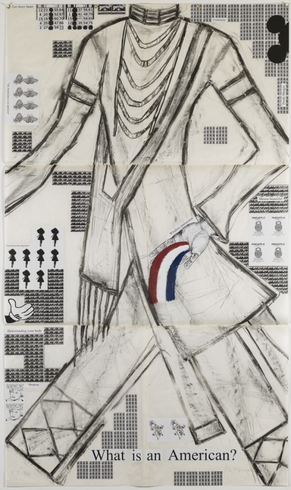 Image: Jaune Quick-to-See Smith (b. 1960), What Is An American?, 2001-03, lithograph, chine collé, monotype, 68 x 40 in, Gift of Ofelia Garcia, © Jaune Quick-to-See Smith