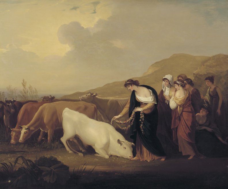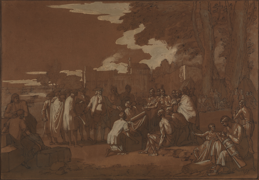 Benjamin West was the first American-born artist to earn acclaim outside his homeland. West was born in Springfield (now Swarthmore), Pennsylvania, and his early artistic promise encouraged Philadelphia's leading citizens to finance his training in Rome. Subsequently, in 1763 West traveled to London and never returned to the Colonies. His acclaim as a painter of historical scenes attracted the attention of King George III. West was appointed official history painter to the king and was a founder and later was elected president of the Royal Academy. Well aware that, as an American, he was a novelty, West used this mystique to his advantage, claiming that he had learned color mixing from Native Americans. He greatly contributed to American art in his role as teacher and advisor to the many early American artists who came to London to study with him.