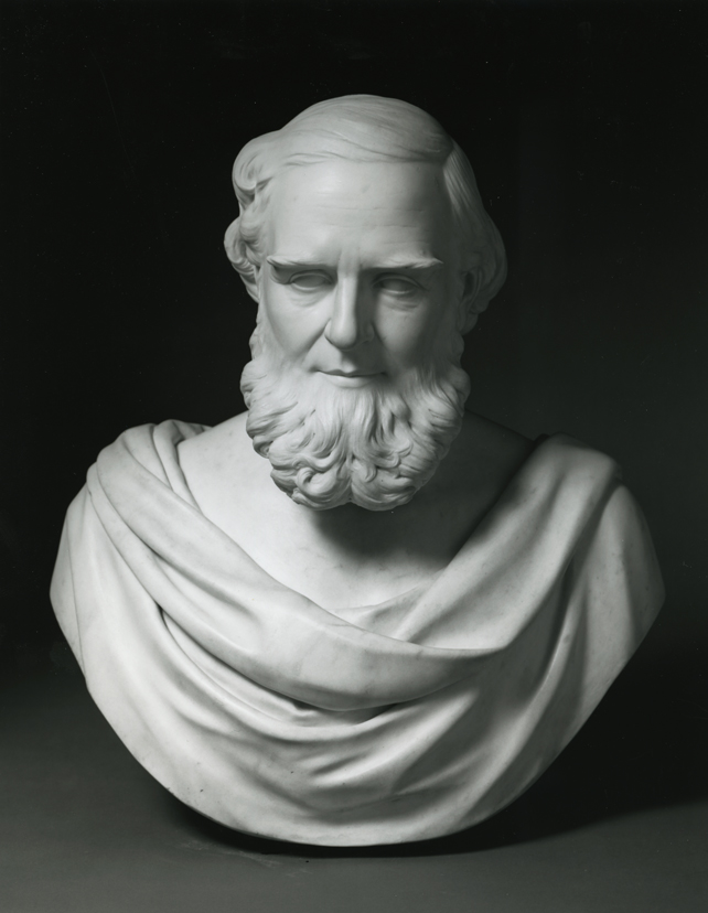 This posthumous portrait of Benjamin Franklin Peale (1795-1870) was probably commissioned by his widow. Starkey would have used a photograph or a painted portrait as his model. The carving, which was almost certainly done by Starkey himself, is very skillful. The sculptor was most likely at mid-career when he executed this work. Its naturalistic style, execution in marble, and the use of the dead eye, and the toga suggest that he had been steeped in the late neoclassical tradition, which continued well into the second half of the nineteenth century in provincial areas.