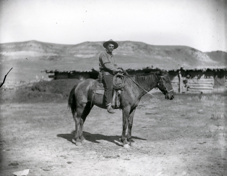 Cowboy with dark neckerchief, on dappled horse