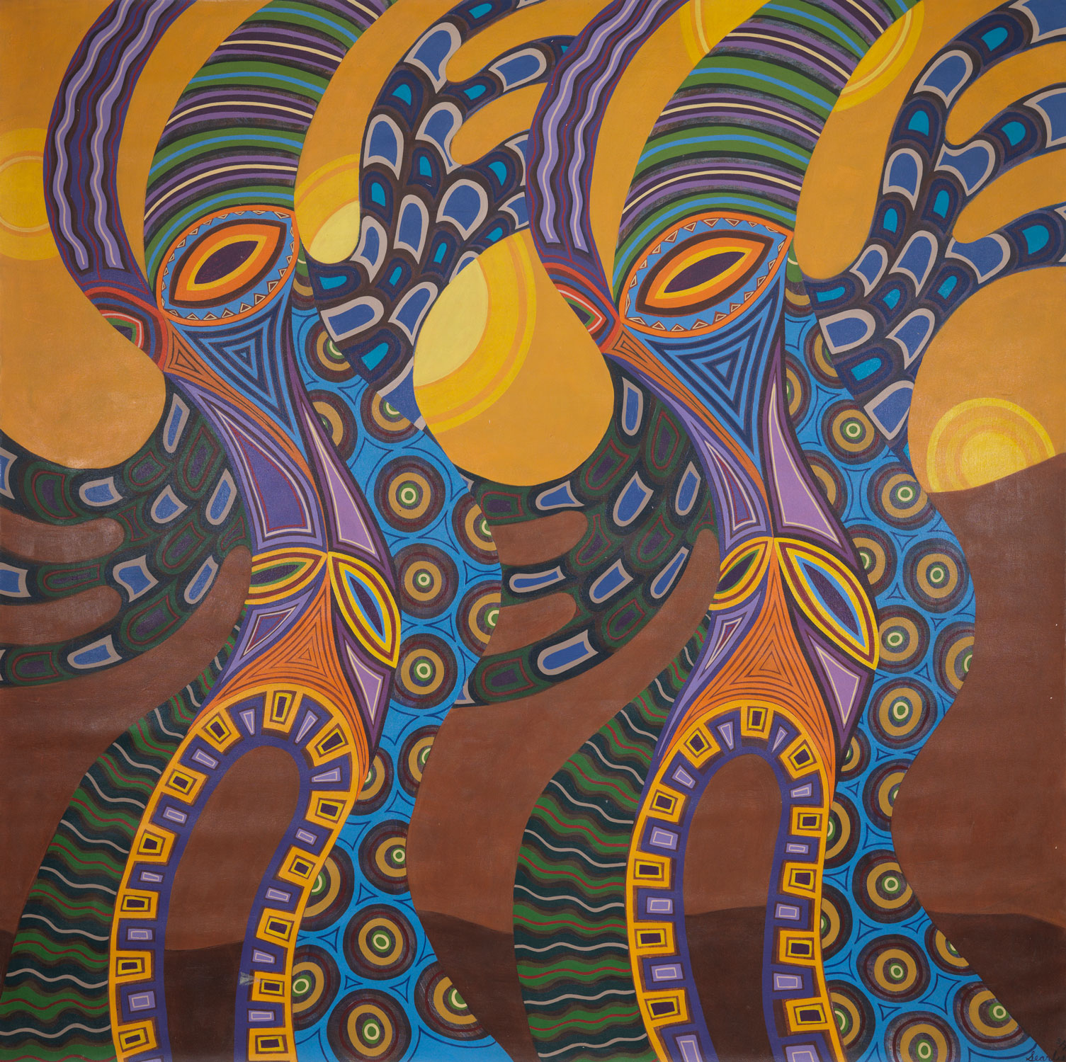 "Dance of Twin Souls," strongly reflects the aesthetic consideration of the AfriCobra group from Chicago in the 1970's, which sought to reinterpret African influences into a contemporary African-American context. In "10 in Search of a Nation," Jeff Donaldson, a leading member of AfriCobra outlined a set of formal principals that "African people can relate to without formal art training and or experience." These included incorporating the symmetry and rhythm of jazz and African textiles, using natural forms as found in nature and having a lustrous "shine" similar to the patina of African sculpture. A hallmark of the AfriCobra influence was the intense, often psychedelic, colors. The end result was to be "expressively awesome" so that the art would "heighten the viewer's spiritual awareness and political consciousness."