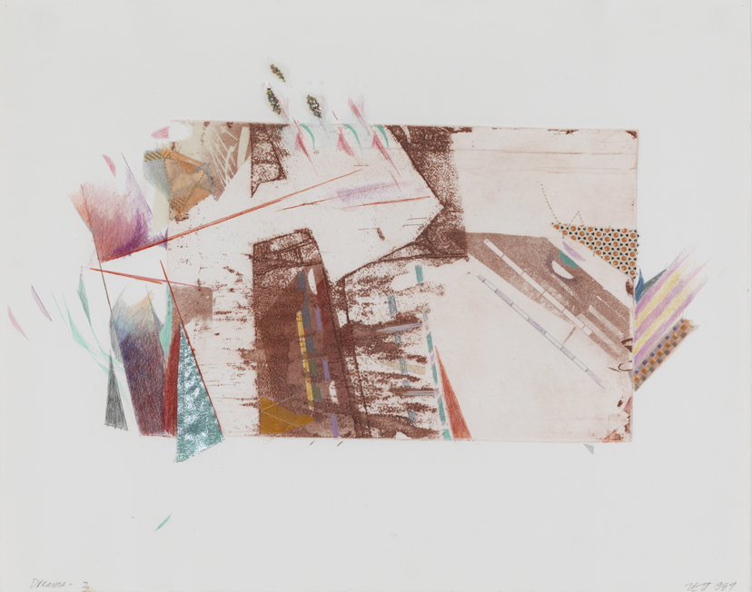 Mixed media (etching, collage, colored pencil, fabric, paper and thread) on white wove paper