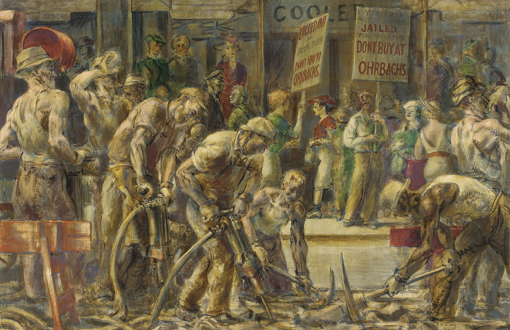 Despite his privileged origins in an upper-class family, Marsh was deeply affected by the plight of the common man, and portrayed scenes of New York life from Depression era breadlines to the beaches at Coney Island. Painted during an era of labor unrest in Union Square, "End of 14th Street Crosstown Line" juxtaposes construction workers tearing up old trolley car lines with picketers demonstrating against Ohrbach's, a store that had refused to allow its workers to unionize. Masterfully painted in egg tempera, a demanding technique he had been using since the late 1920s, the work exhibits Marsh's use of signs and other graphics to enhance meaning.