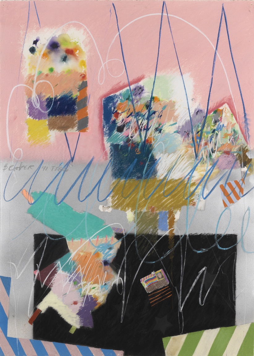 Pastel, watercolor and spray paint on paper