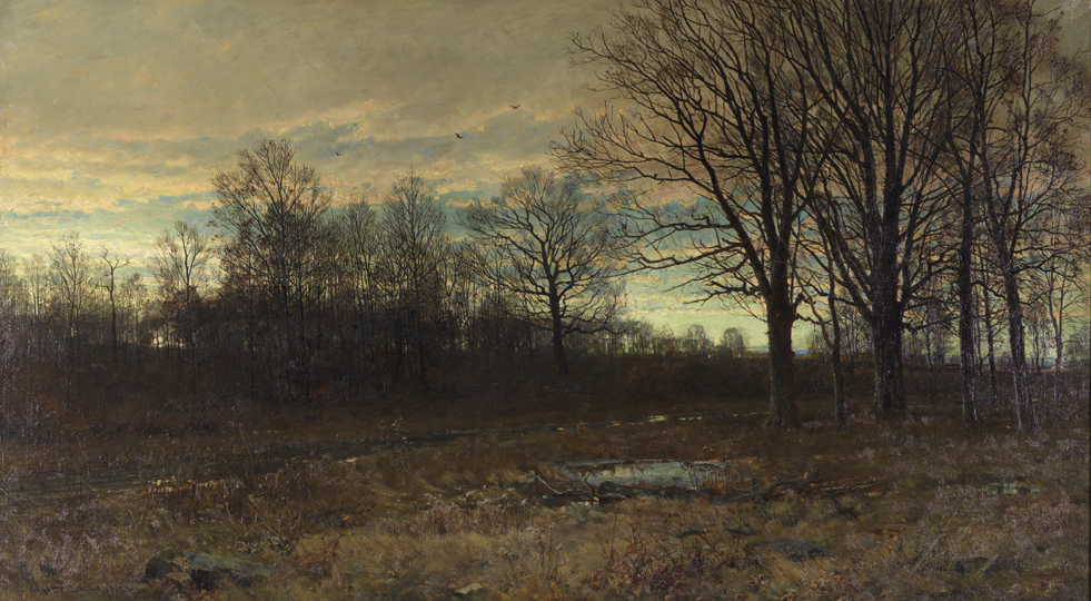 "February" is an exception to the marine paintings that began to preoccupy Richards after the late 1860s. In this landscape, painted near the artist's farm in Coatesville, Pennsylvania, Richards evokes the chill and stillness of winter through the lowering gray sky, barren trees in the foreground, and his characteristic silvery tones. The artist manages to convey a dual sense of the truth-to-nature advocated by John Ruskin's "Modern Painters" and the Pre-Raphaelite artists he admired: not only accurate topography but also the experience of the place, so vivid that the viewer can almost hear the crunch of footsteps across the frost-covered grass. The Academy owns eight canvases and ten watercolors by Richards - a testament to his popularity with Philadelphia collectors.