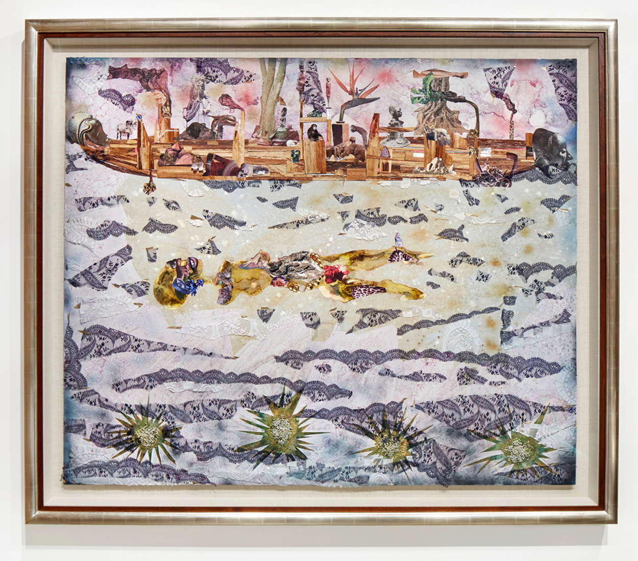 Mutu’s stunning collage If we live through it, She’ll carry us back typifies her artistic practice. Known to create large-scale collage works that subvert preconceptions of the female form, this narrative work subverts traditional representations of migration and movement, themes predominantly depicting Western colonization as exploration. If we live through it… is part of Mutu’s Nguva na Nyoto (Sirens and Serpents) series, referencing a mythic imaginary world in which “she,” hybrid warrior-women, are the protagonists. “The black female body has been violated and revered in very specific ways by the outsider–Europeans, especially. The issues that pertain to race are: pathologizing the black mind, exoticizing and fearing of the black body, objectifying the body as a specimen, or a sexual machine, or a work animal, or relating the black body to non-human species as a way to justify cruelty… all these are practices that are placed excessively upon the black female body,” says Mutu in a 2014 article with Deborah Willis for Bomb Magazine. This perhaps epitomizes the protagonist’s mutilated form in If we live through it, She’ll carry us back, a visual reflection of bodily trauma and healing.