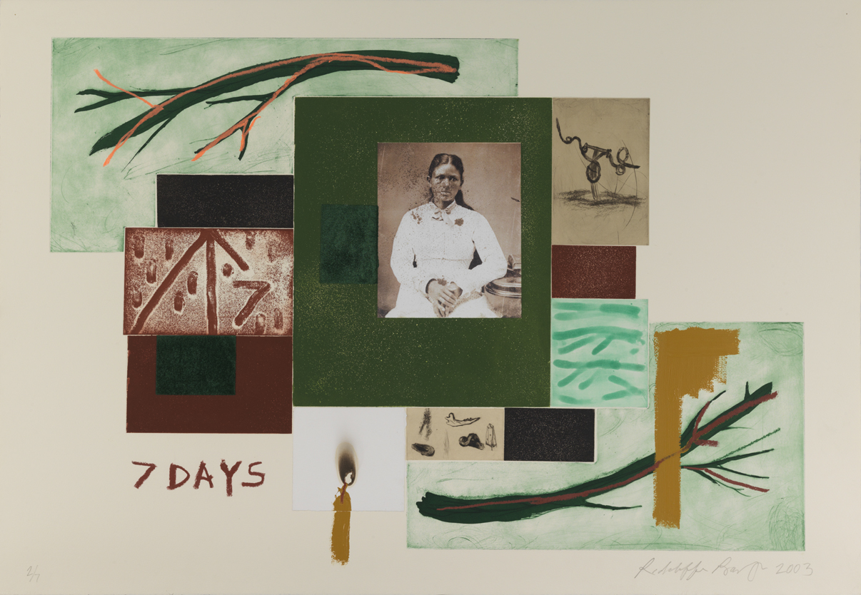 Color aquatint with color photocopy, chine collé, velvet and handwork, ed. 2/7