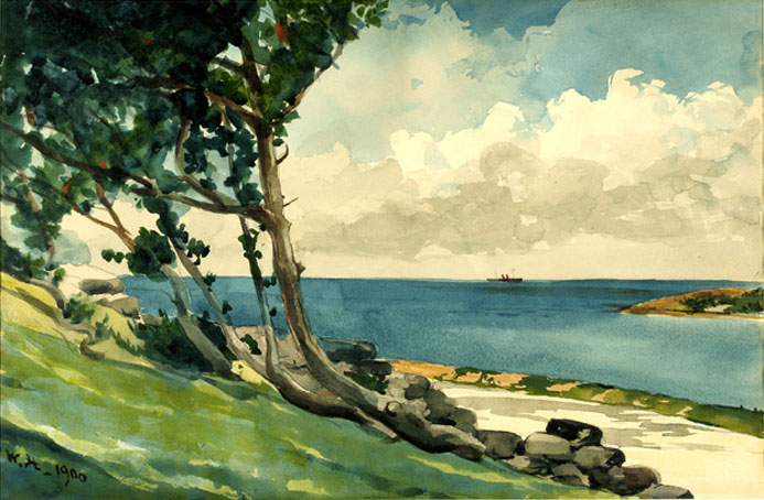 As he got older, in order to escape the harsh conditions on Maine's winters, Homer made frequent trips to Cuba, Nassau, and Bermuda. In this watercolor, Homer juxtaposed the shade of the island's trees with the intense blue of the sea, while depicting a single ocean liner in the distance to lead our eye through the composition. Homer did watercolors throughout his career as a source of income, but these works were a source of pride for the artist. He once said, "In the future, I will live by my watercolors," and indeed his works in this medium are today the most prized in American art.