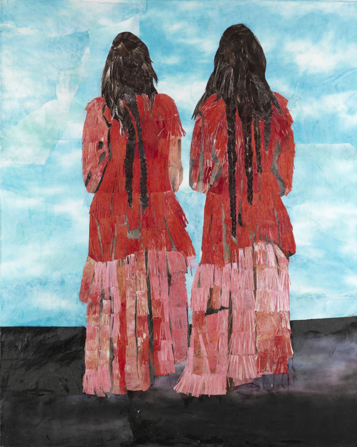 "I started these works as a creative challenge. Usually the figures in my work face forward and confront the viewer directly. Here, I sought strategies to create visual impact without the benefit of face-to-face confrontation. I always use clothing to build presence; here I also relied heavily on color. The bright red clothes feel less like garments and more like suits of armor. One gets the sense that these women are prepared to stand strong in the face of adversity. The braids are another way for the figures to assert personhood. Across cultures, braids have deep symbolic resonance. They are symbols of beauty, honor, and strength, and demonstrate connection to the earth and one’s ancestors. Without making a specific cultural reference, the work allows for all symbolic possibilities. I gravitate toward symbols with global cultural significance, such as braids and birds, with the hope that they allow for diverse audiences to bring their own understanding to the work."