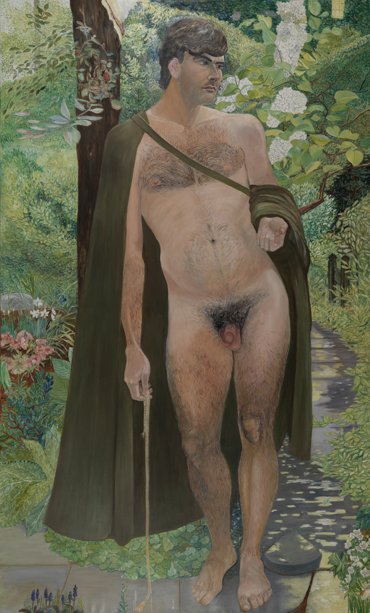Sleigh’s practice as a portraitist reached a pinnacle in the 1970s and 80s during First Wave Feminism as they questioned power dynamics in the subject-object paradigm of viewership through her rendering of male nude subjects in feminine poses. As Joan Semmel wrote about Sleigh’s male nudes, the subject “is used as a vehicle to express erotic feelings, just as male artists have always used the female nude.”* This particular male nude, “Pluto: Robert Lucy,” 1994 is one in which her subject inhabits the character of Pluto, god of the underworld. Rather than existing within a domestic space, like many of Sleigh’s other nudes, Robert Lucy, a friend and fellow artist, confidently leans against a tree, bedecked in a cape, and staring off to the side. This large, full-length nude is one of the largest and most complex of Sleigh’s career and highlights her interpretation of friends through mythology within the medium of paint.