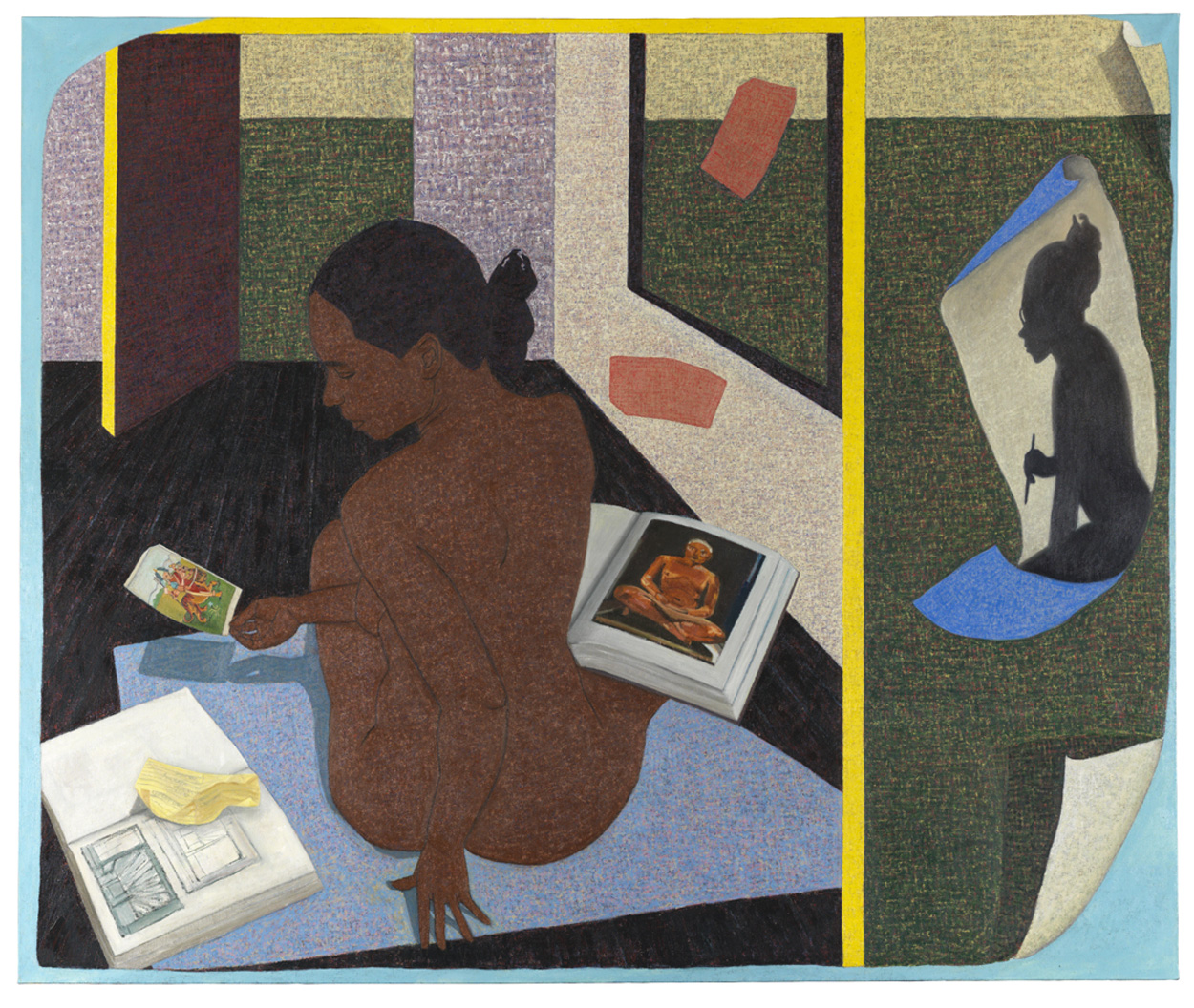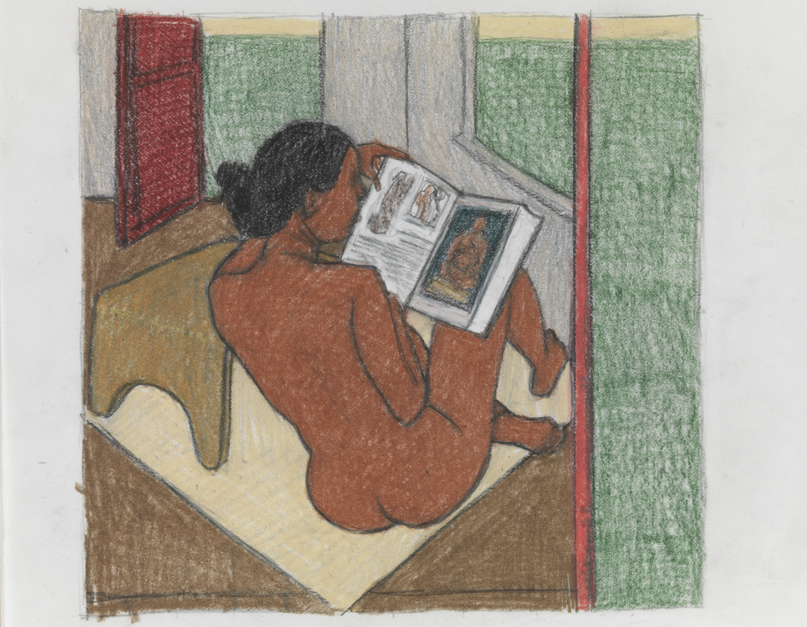 A brown woman sits cross-legged with a book full of images. The figure in the book – like the subject herself – rests a book on her right knee. In her left hand, she holds a worn prayer card, a common item in Indian homes. The viewer faces her back as the subject is unaware we are observing this intimate moment. The corner of the image curls, resembling a book page; this subject, with her multifaceted identity, is worthy of being in books like those she reads. In this sketch, subject, like artist, contemplates a rich identity and the intersection of the two. In A Real Allegory of Her Studio, Ahuja embraces her multifaceted identity, a principal subject in the artist's oeuvre.