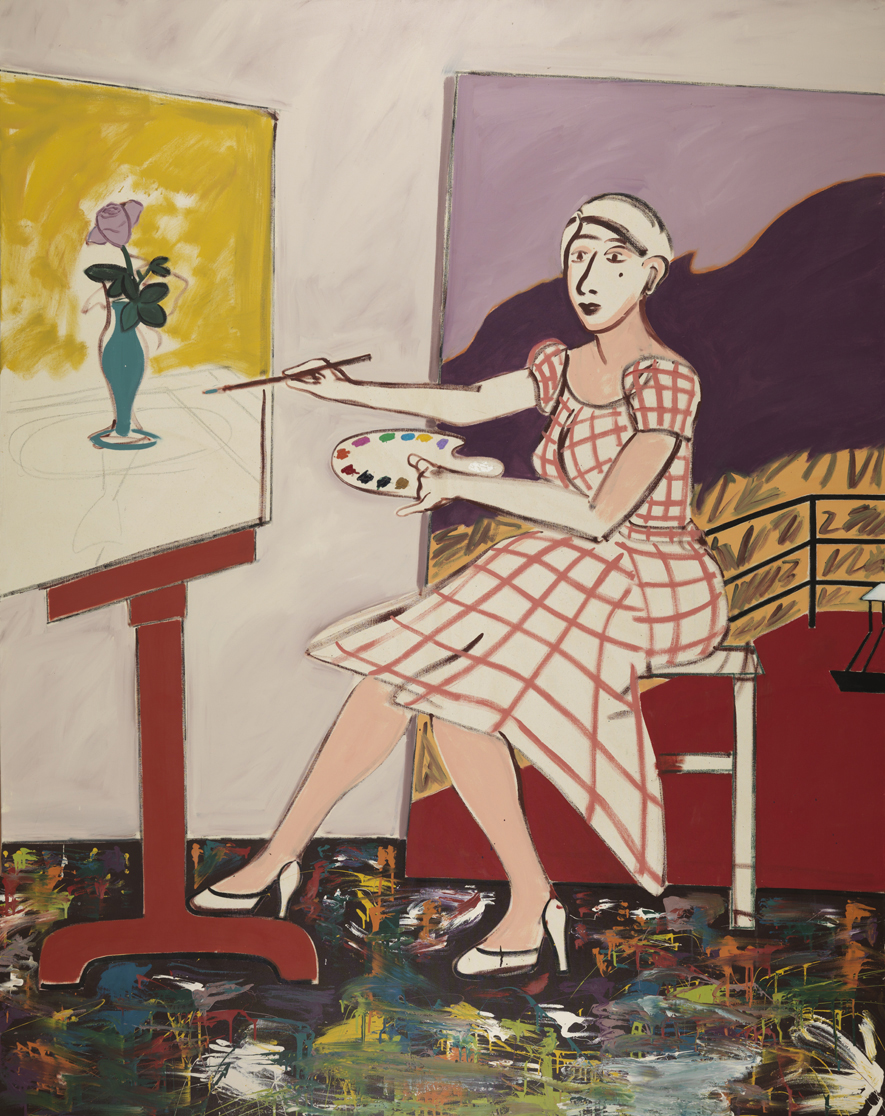 Throughout the 1960s Brown honed her figurative style in thick impasto that incorporated cartoonish figures. This would gradually shift in the 1970s, as she experimented with autobiographical subject matter and the incorporation of spiritual beliefs that she renders in a more restrained layering of paint, often in flat planes of color, as seen in Self-Portrait, 1977. Her brushwork in the work varies, however, as seen in the floor splatters and yellow surrounding the vase, evincing her earlier innovations with thick impasto paint and an abstract-expressionist mode. In many ways, this work is a pivot between her early work and middle period. The background, behind the figure of Brown emphasizes this shift, as Joan’s 1976 work, The Kiss, provides a type of illusionary landscape. The Kiss, 1976 is one of Brown’s most forthcoming perspectives into her personal life, as numerous scholars speculate that it is a self-portrait of Brown wrapped in the arms of her lover among the mountains. In Self-Portrait, only the mountain terrain is visible behind the figure, providing further abstraction to the scene from which Brown, the artist, carefully articulates a still life work. This juxtaposition between abstraction and figuration embodies Brown as a painter and is displayed in Self-Portrait to full effect.