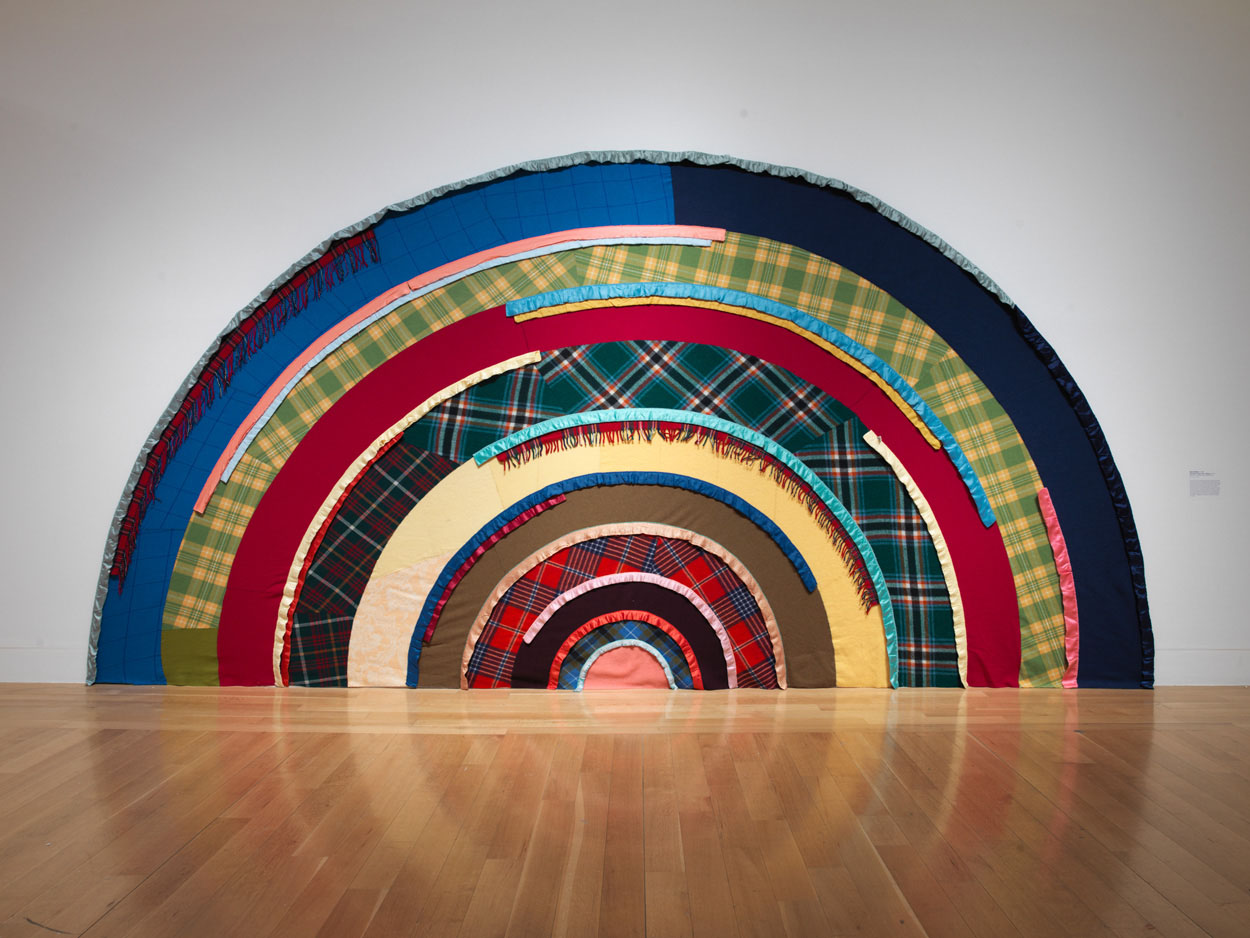 Measuring nineteen feet in width, Watt’s monumental wall-based work is comprised of reclaimed wool blankets, a material important to Indigenous populations in the Americas. Watt notes that blankets “are everyday objects that can carry extraordinary histories of use,” and that “in Indigenous communities” such as the Seneca Nation (of which Watts is a member), “blankets are given away to honor those who are witness to important life events.” Skywalker/Skyscraper, by extension, was inspired by Watt’s move to Brooklyn, and her discovery that the border of Cobble Hill and Gowanus (the locations of her home and studio, respectively) was “where Iroquois ironworkers and their families settled in the 1950s, when most of Manhattan's skyscrapers were being built.” Watt remarks that “these Iroquois were called ‘skywalkers’ due to their ability to work on the high steel without safety harnesses.” With her textile work, she invites viewers to consider our built and natural environments, as well as the impetus to constantly “reach” towards a mythic space that towers above us.