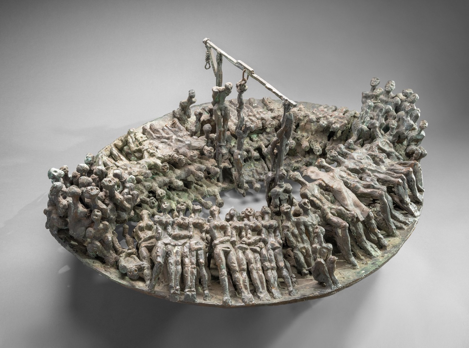 Inspired by the middle passage, Rhoden’s “Slave ship” depicts the hull of the ship, with bodies stacked in rows on top of one of another around the edge, with figures grouped sitting upright at the stern and bow of the ship, chins turned upward. At the center of the basin are gallows, where two figures are tied to the posts and one more figure is hung from the center by their wrists. “Slave ship” is one of the few sculptures in John Rhoden’s oeuvre dedicated to a historical theme. In a 1990 interview with Gil Coker, Rhoden said, “Recently I started doing the slaveship. Everybody is interested in the slaveship and when I had to do research on the slaveships and how slaves were packed into the hold of the ship I got real sick. I said, ‘This isn't for me.’ But I got over this feeling so I am doing it. There are two or three other things along that line. When it comes to politics I am very aware of social things but it gets me too much inside.” In Committed to Memory: The Art of the Slave Ship Icon art historian Cheryl Finley argues that since the Harlem Renaissance of the slave ship icon “was (and continues to be) reappropriated, symbolically repossessed, by the descendants of those who were the subject of the image, by diasporic Africans, that is, by black Atlantic artists and their allies. It has since come to have a special place in the souls of those black folk who descend from that forced migration, and it has proven to be one of the most powerful images of the last 230 years” (Finley, 2018: 5-6).