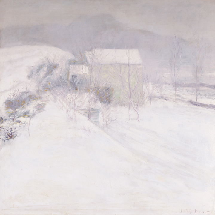 Regarded as one of the finest American impressionist painters, Twachtman had a highly personal approach to his landscape images, returning several times to the same scene, not only to observe and record the changing effects of light and atmosphere, but to capture the quiet, meditative states they inspired. By 1899 the Cincinnati-born Twachtman had purchased a seventeen-acre farm near Greenwich, Connecticut, the scene of this image. Much of Twachtman's acclaim lies in his images of snowy landscapes executed during his so-called "Greenwich Years." "Never is nature more lovely than when it is snowing," he wrote. "Everything is so quiet... all nature is hushed to silence."