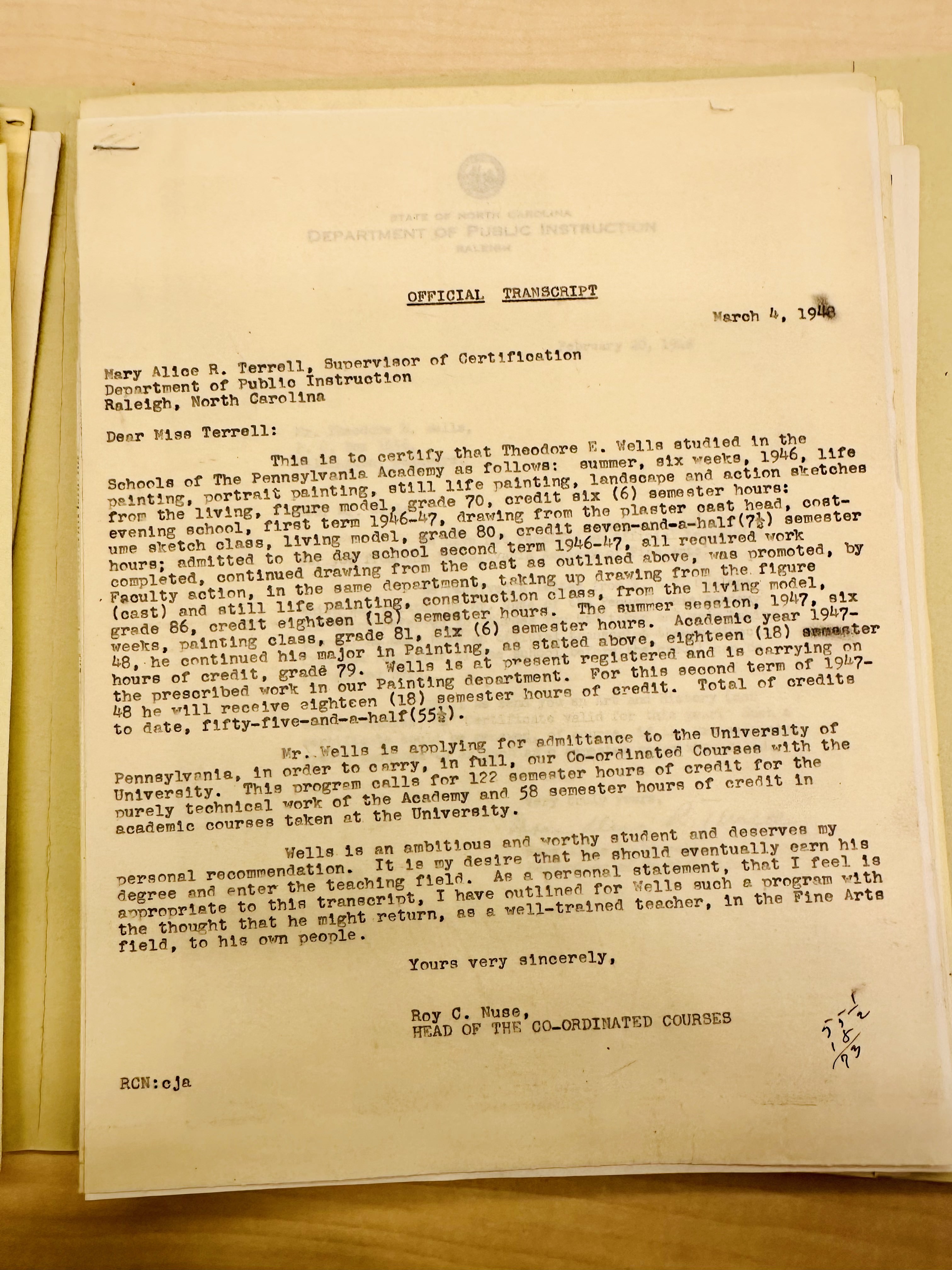 In March 1948, Roy C. Nuse sent an official transcript and personal statement about Wells to the Department of Public Instruction in Raleigh, NC. According to Wells' official transcript, “May 1948,” is the “day of withdrawal” from the Academy. This letter also mentions that Wells was applying to the University of Pennsylvania (using the same language as in the letter dated July 1947 to the department of education in Delaware). Roy C. Nuse concludes both letters with: