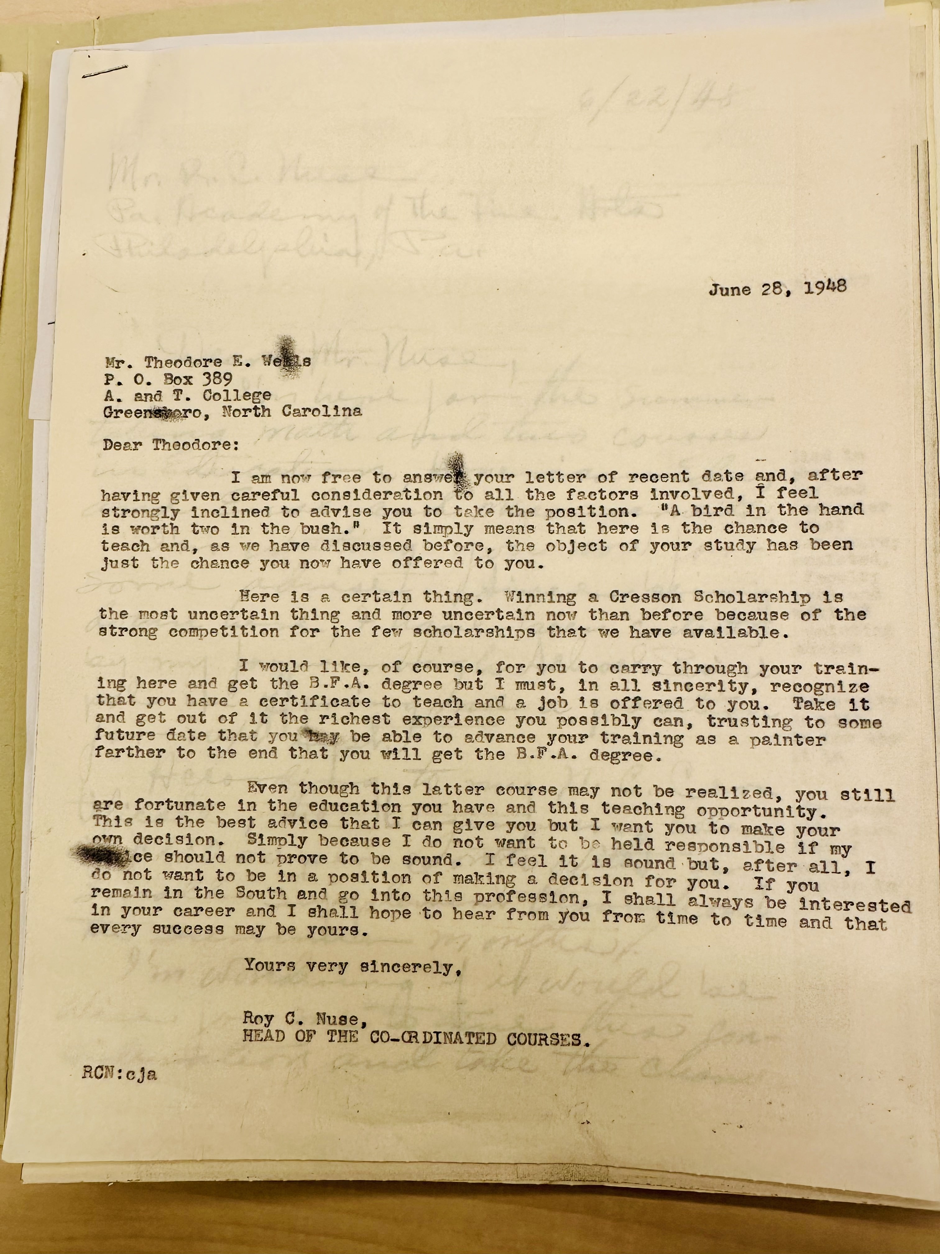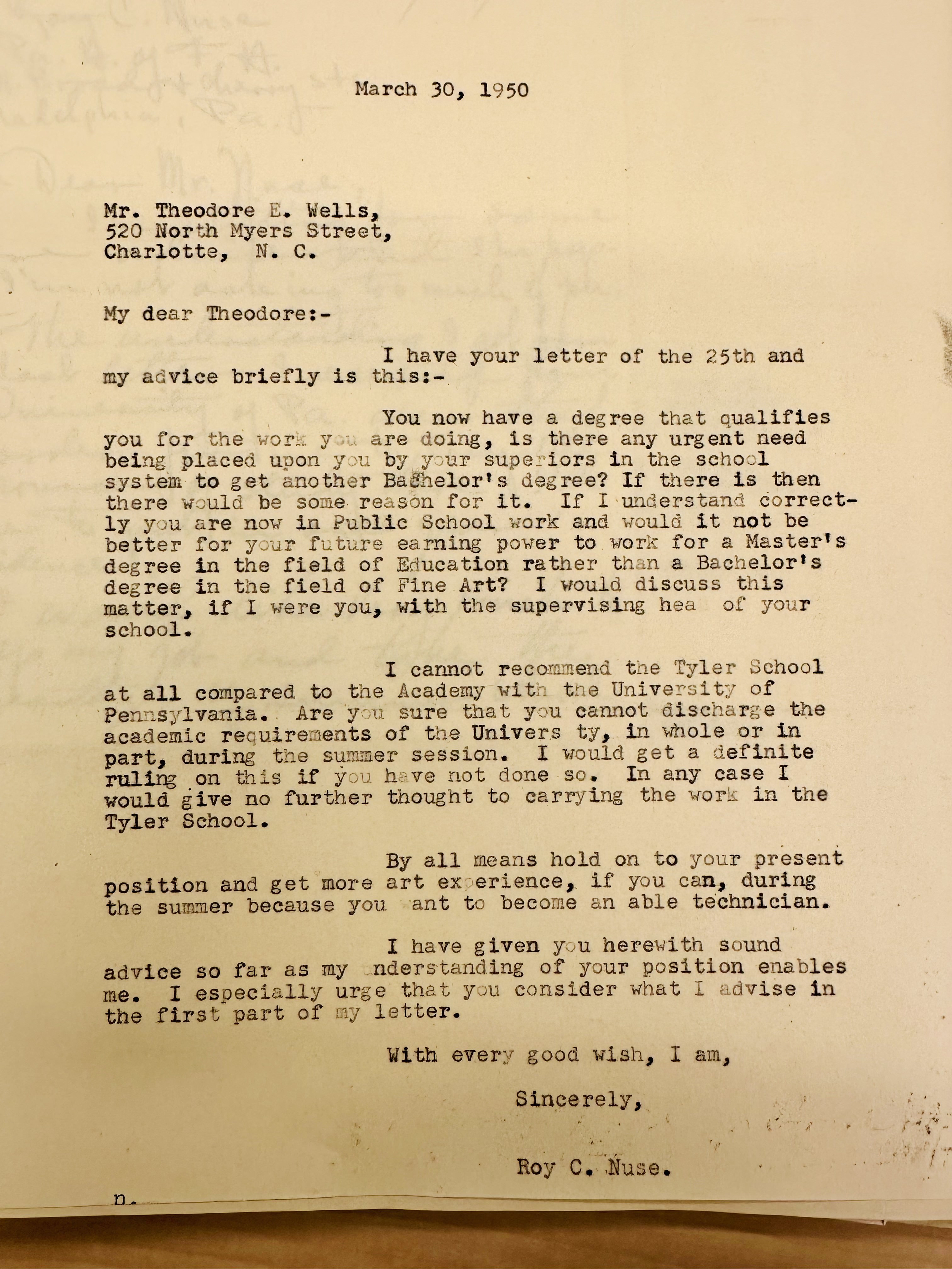 A letter from Roy C. Nuse in June 1948, implies Wells sought advice on whether to take the job or continue his arts education at PAFA. Roy C. Nuse wrote “...after having given careful consideration to all the factors involved, I feel strongly inclined to advise you to take the position.” Further in the letter, he wrote, “Here is a certain thing. Winning a Cresson Scholarship is the most uncertain thing and more uncertain now than before because of the strong competition for the few scholarships we have available….I would like, of course, for you to carry through your training here and get the B.F.A. degree…” and continued on to encourage Wells to take a teaching job offered to him.