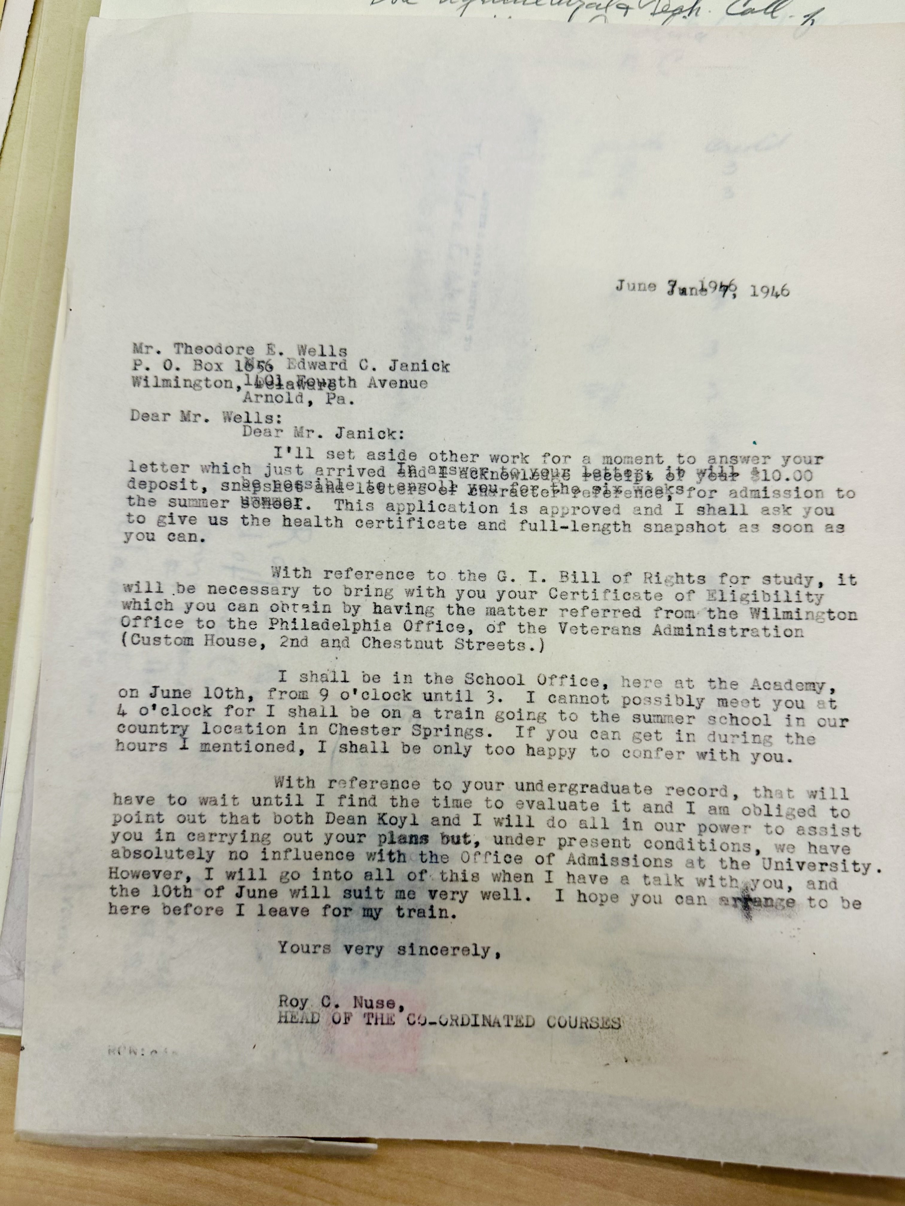 In July 1948, Wells responded to Roy C. Nuse's letter, thanking him for his “advice and kindness.” He also requested a school catalog for the upcoming school year. In March 1949, Theodore re-applied to PAFA’s Chester Springs School, and in an official transcript, Roy C. Nuse wrote: