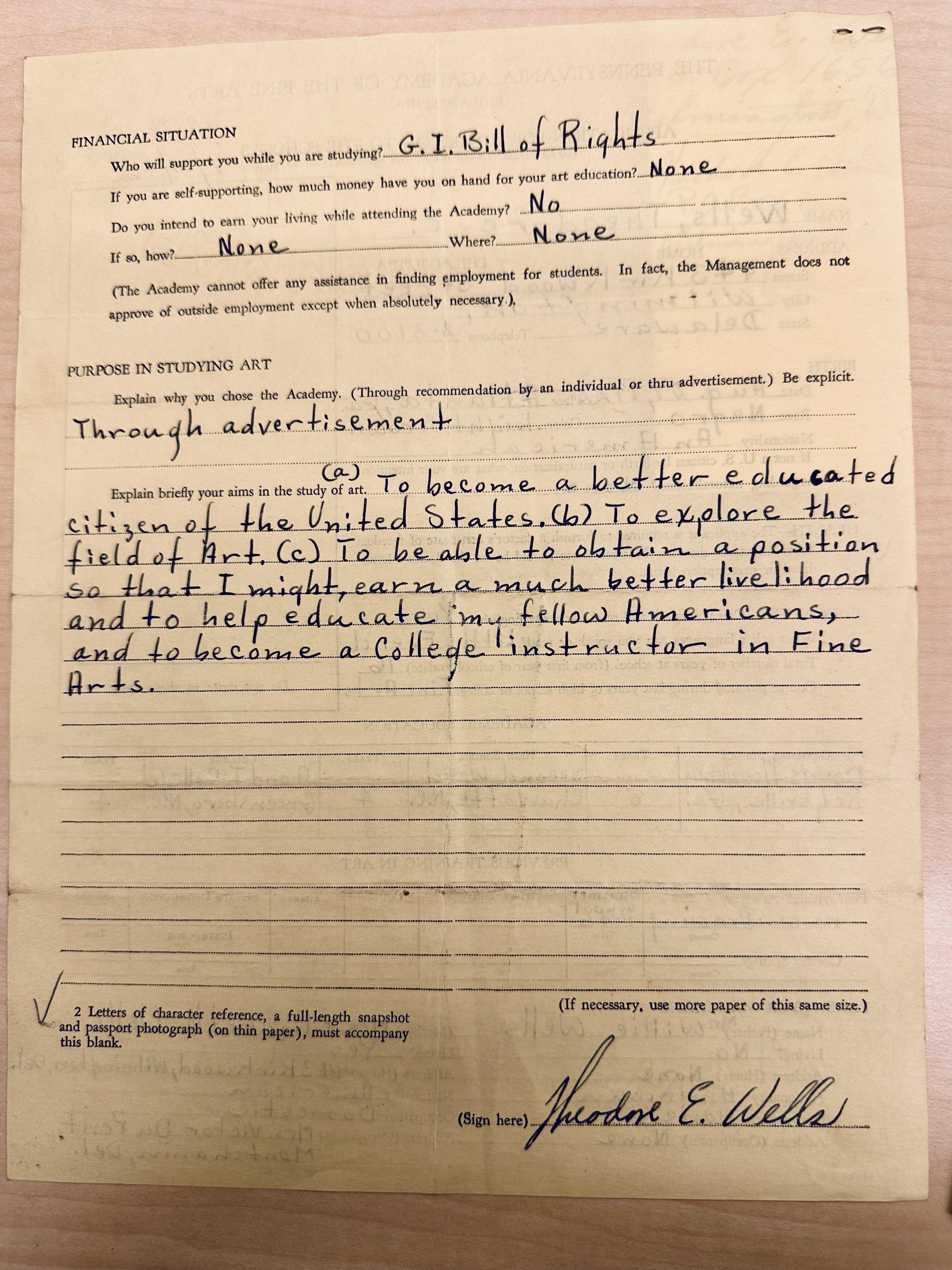 In his application, in response to the prompt Explain briefly your aims in the study of art, Wells wrote: “(a) To become a better educated citizen of the United States. (b) To explore the field of Art. (c) To be able to obtain a position so that I might earn a much better livelihood and to help educate my fellow Americans and to become a College Instructor in Fine Arts.”