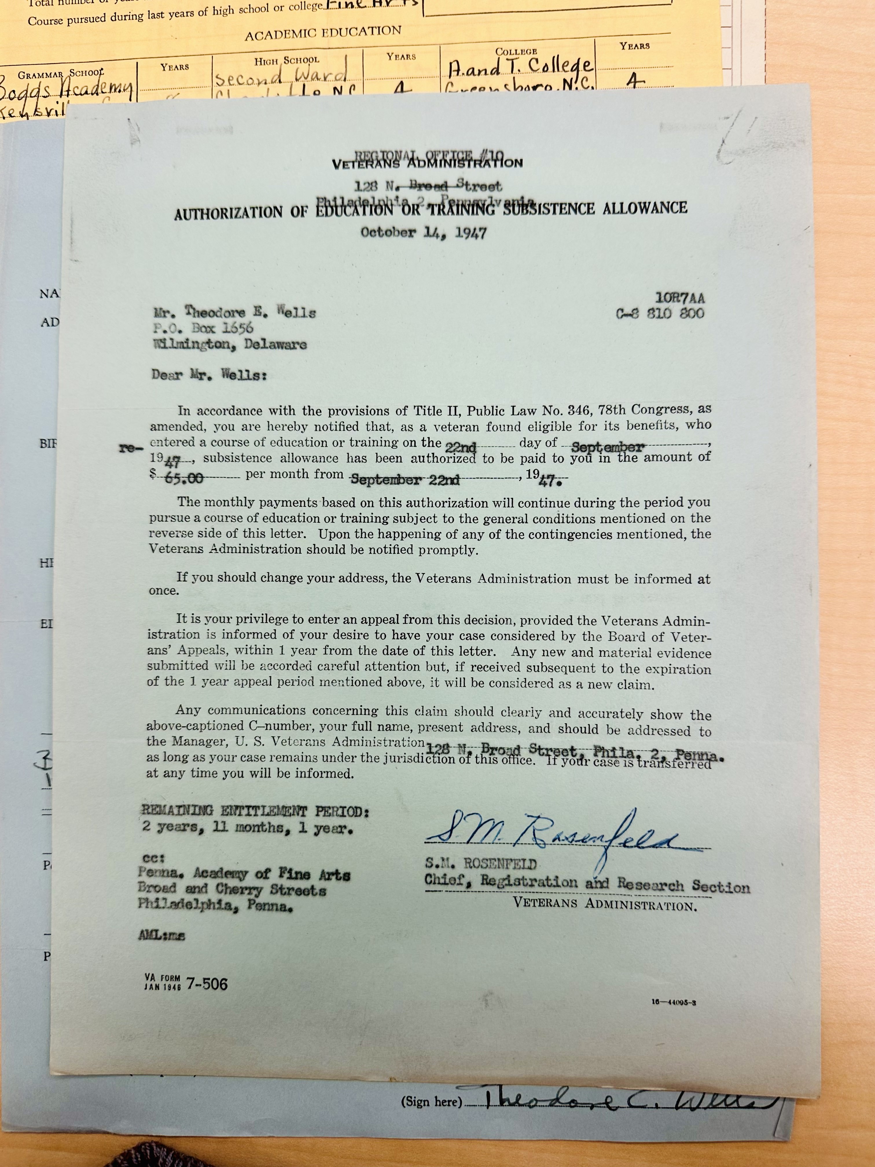 Having graduated from the Agricultural and Technical School of Greensboro, NC, Theodore Wells, at the age of 23, commenced his studies at the Pennsylvania Academy of the Fine Arts (PAFA) in 1946. Utilizing the benefits extended to him as a WWII veteran through the GI Bill, Wells received monthly payments from the VA covering tuition and living expenses. This financial support facilitated his engagement in coursework and professional training.