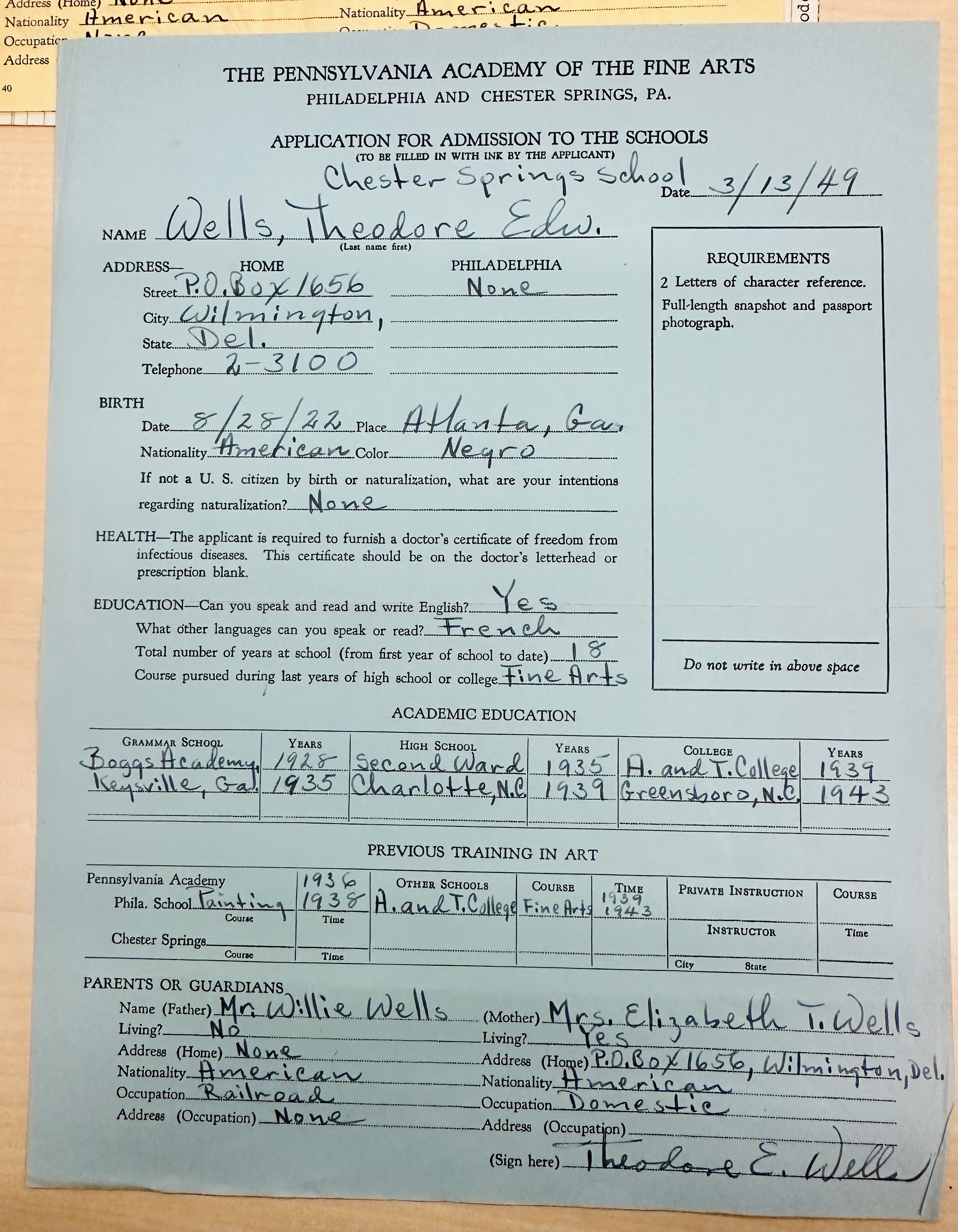 Theordore’s education at PAFA continued into the first term of the ‘46-47 academic year with evening courses in drawing and sketching. In November 1946, Wells was accepted into the “day school” for the term starting January 27. Around July of 1947, Wells applied for admittance to the University of Pennsylvania “in order to carry, in full, [...] co-ordinated courses with the University,” according to a recommendation letter from Roy C. Nurse to the State Board of Education in Delaware, where Wells was a resident.