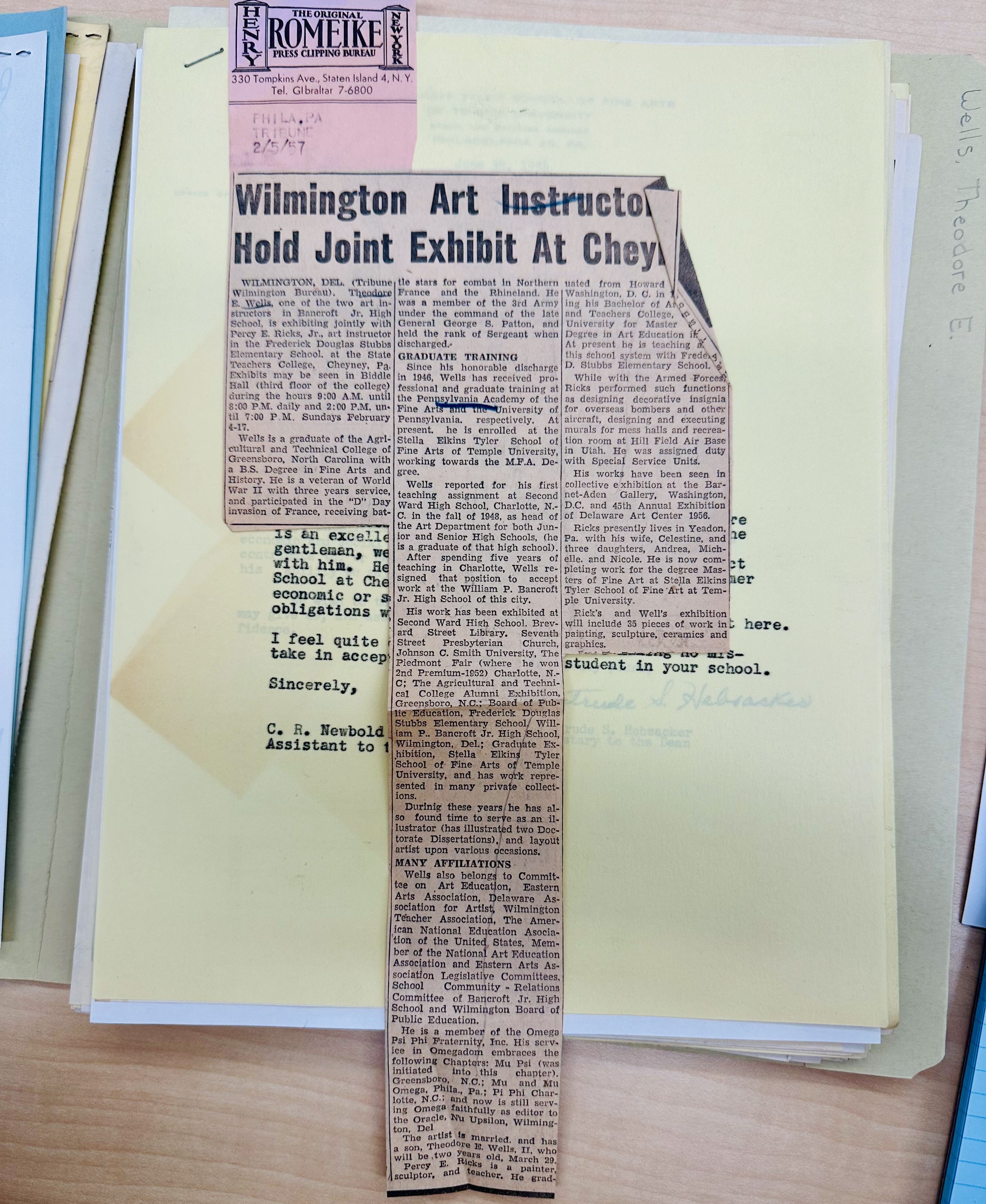 In a Philadelphia Tribune article dated February 5, 1957, Theodore Wells was mentioned as one of two art instructors at Bancroft Jr. High (currently known as The Bancroft School) in Wilmington, Delaware. The article announced that he was collaborating on an exhibition with Percy E. Ricks, Jr., an art instructor at the Frederick Douglass Stubbs Elementary School (now Stubbs Early Education Center). Their joint exhibition took place at the State Teachers College in Cheyney, PA. At the time, in 1957, Wells was enrolled in the Stella Elkins Tyler School of Fine Arts at Temple University, working toward an MFA.