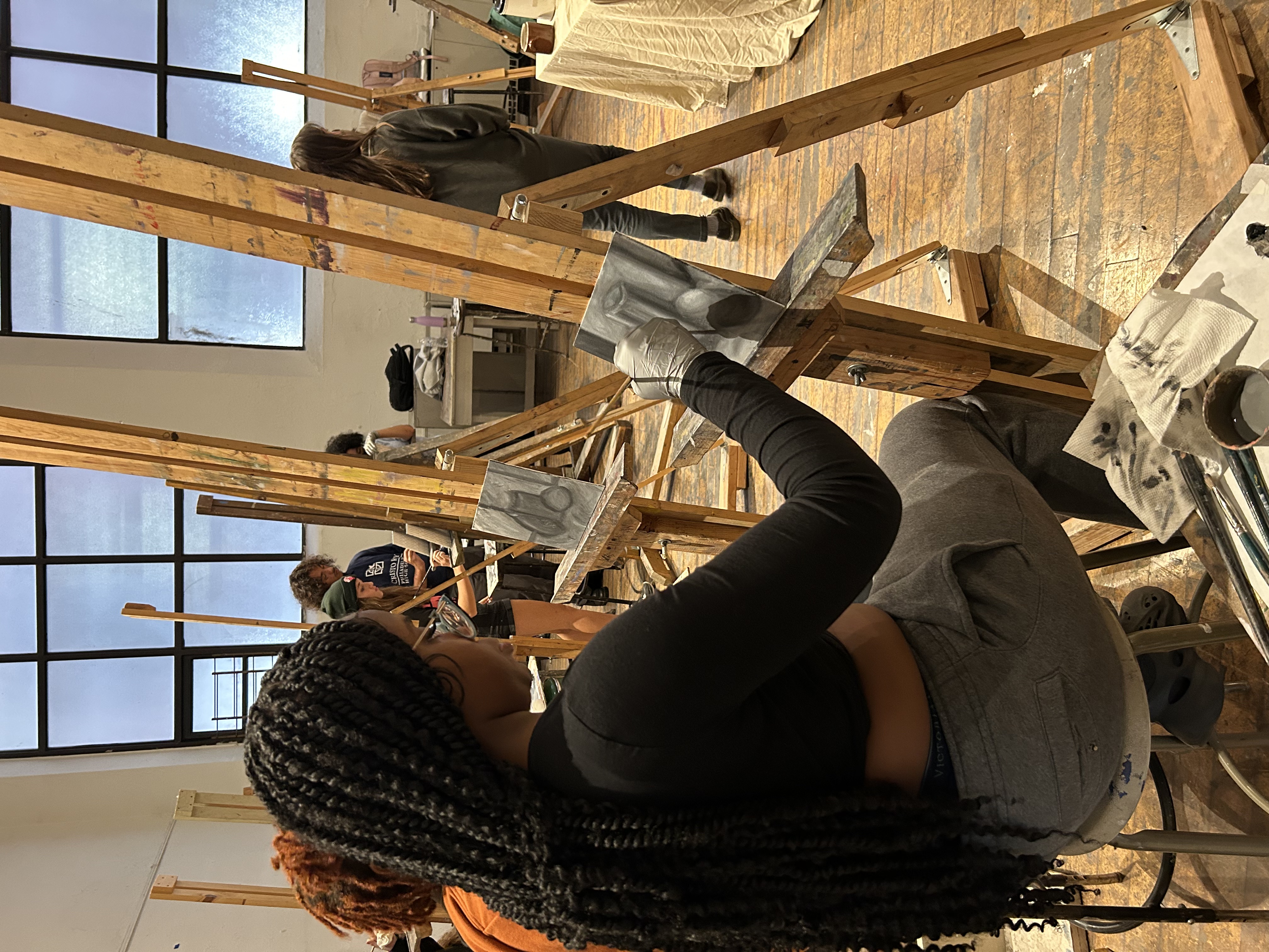 A close-up of a student carefully working on a monochromatic still life.