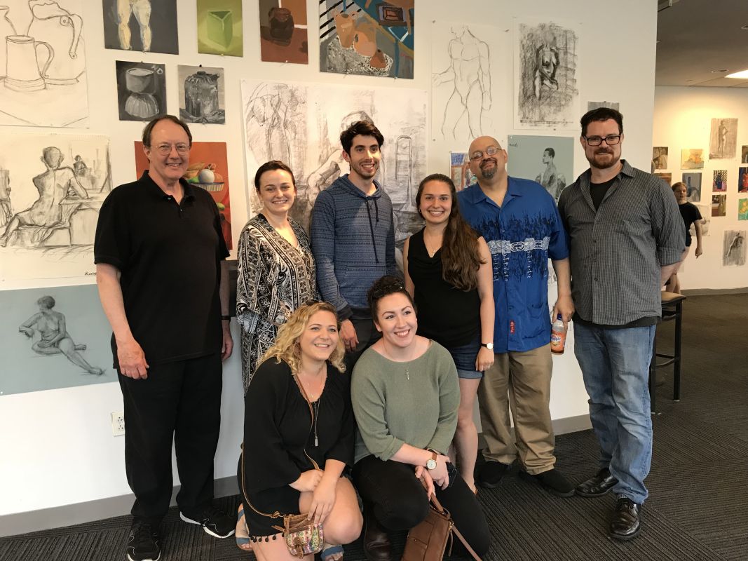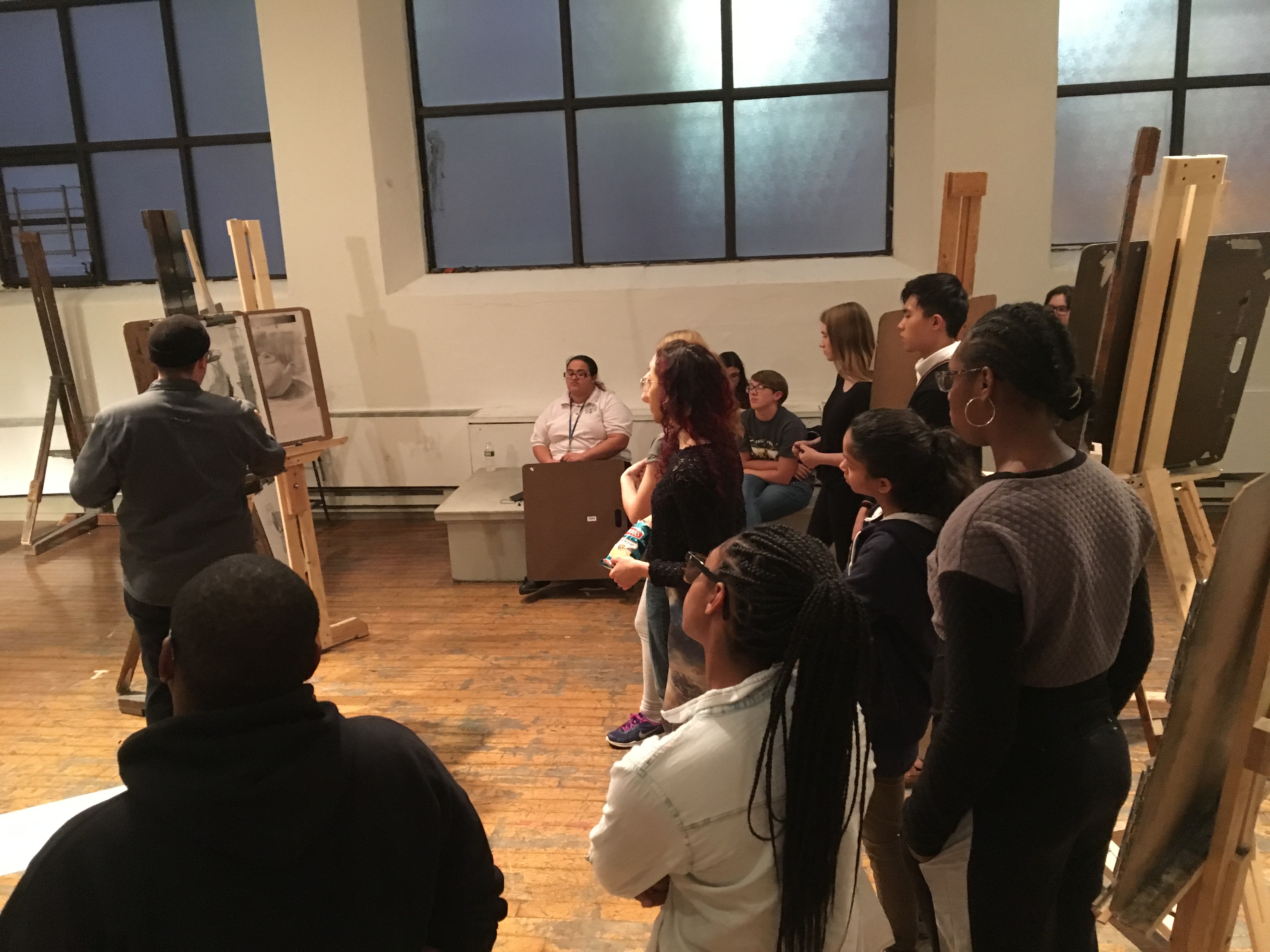 An instructor demonstrates an art technique to engaged students.