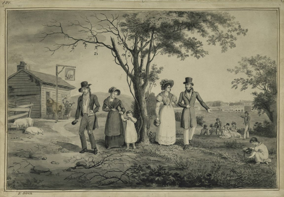 Thomas Birch’s Virtue and Vice, Sobriety and Drunkenness (1815-1830), on loan from the Winterthur Museum in Delaware, simultaneously portrays what life looks like with and without clean water. One side of a "sobriety tree" is displayed in full bloom alongside a happy, healthy family, and the Schuylkill River in the background. On the other side, the tree's branches are bare, with the same family seen upset and crying, as spirits are being drunk at a tavern in the background.
