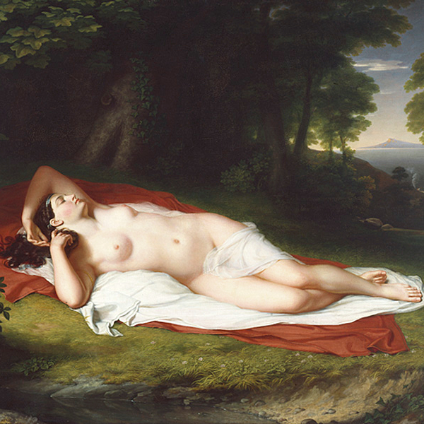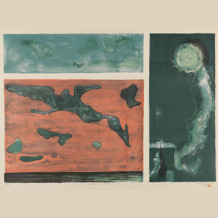 (Left) Bust of Ariadne in Cast Hall, 2024. Photo by Kristin Geiger-Rayca (Center) John Vanderlyn, "Ariadne Asleep on the Island of Naxos," 1809-1814. Oil on canvas, 68 1/2 x 87 in. (173.99 x 220.98 cm.). The Pennsylvania Academy of the Fine Arts, Gift of Mrs. Sarah Harrison (The Joseph Harrison, Jr. Collection), 1878.1.11. (Right) Benton Murdoch Spruance, "Ariadne and Daedalus," 1965. Four color lithograph on cream wove paper, 19 1/4 x 27 1/2 in. irr. (48.895 x 69.85 cm.). Gift of Mrs. Benton Murdoch Spruance © artist or artist’s estate, 1975.5.46.