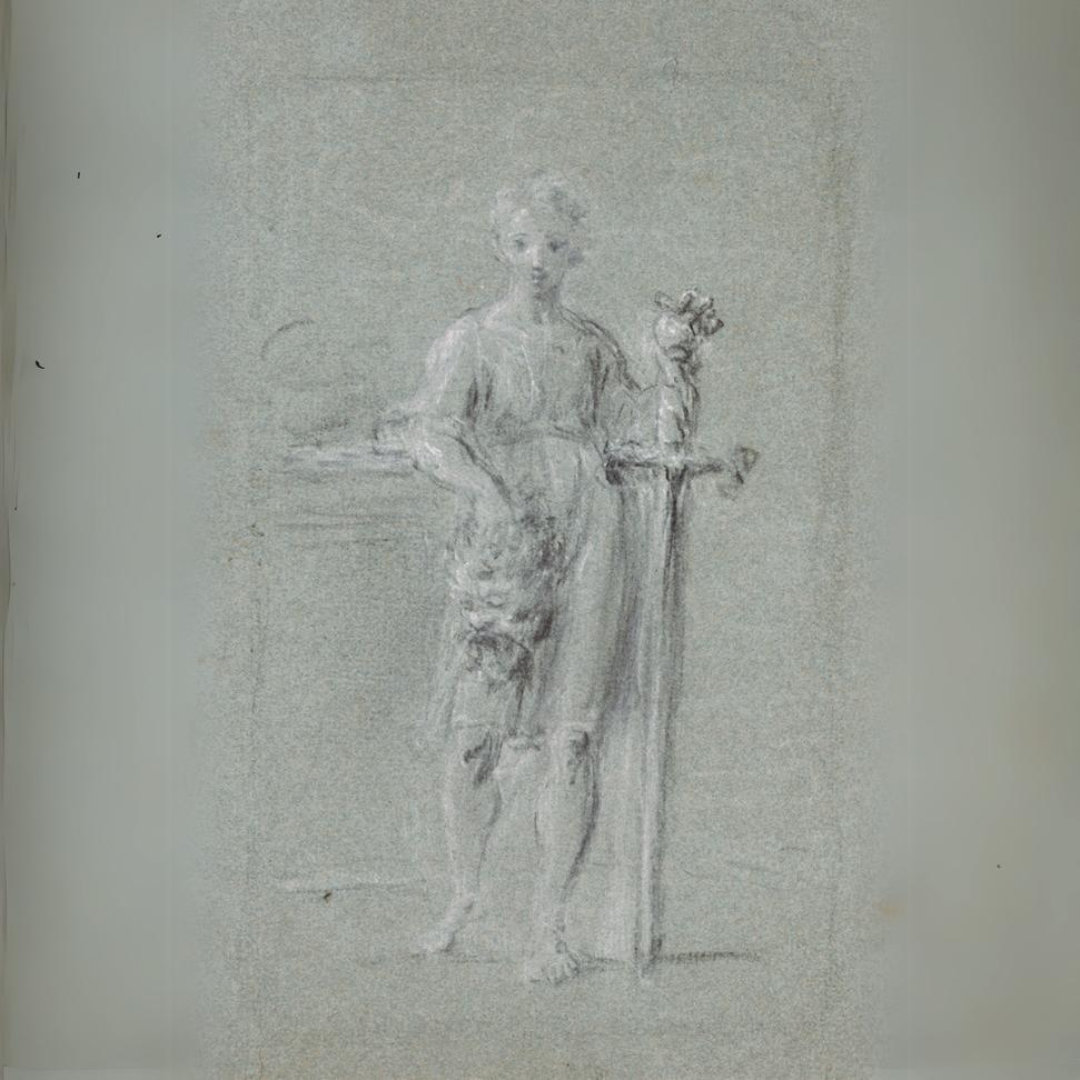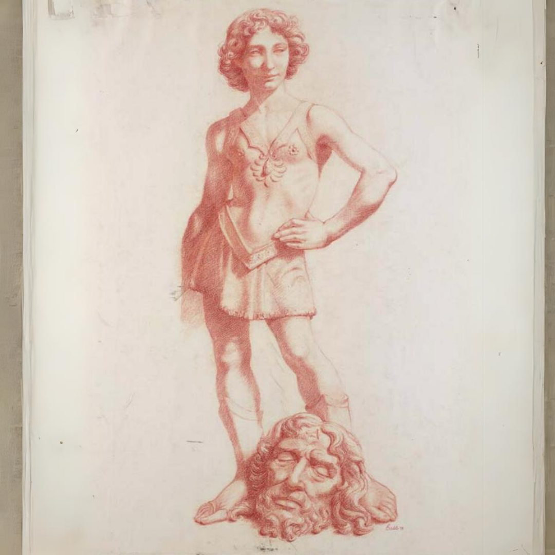 (Left) 'David with the Head of Goliath,' 2024. Photo by Kristin Geiger-Rayca (Center) [David with the head of Goliath], Attributed to Benjamin West, late 18th century. Charcoal drawing heightened with gray/ white chalk on blue laid paper, 9 3/8 x 6 3/8 in. (23.8125 x 16.1925 cm.). Gift of George W. Childs, 1885.4.6. (Right) Lyndall Bass (b. 1952), drawing of a cast of Verrocchio’s David, ca. 1972. Sanguine, 24 x 18 inches. PAFA school collection.