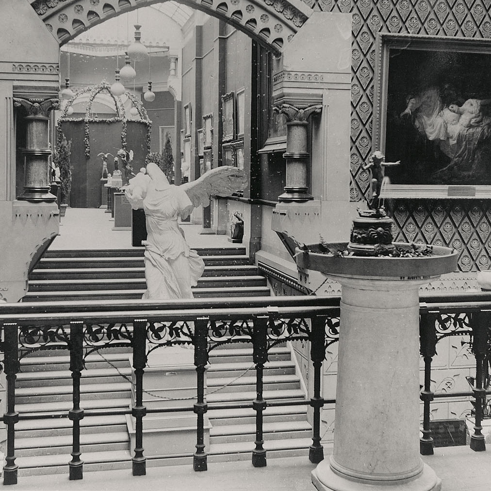 (Left) Nike of Samothrace, Installation photograph of the Main Corridor from the east, at the Pennsylvania Academy of the Fine Arts, 1901. The Pennsylvania Academy of the Fine Arts' Dorothy and Kenneth Woodcock Archives, PC0104_1901_002.(Center) A student uses a plumb bob to align her drawing of the cast of the Winged Victory. Photograph by Cheryl Leibold, 2008 (Right) Nike of Samothrace in Cast Hall, 2024. Photo by Kristin Geiger-Rayca.