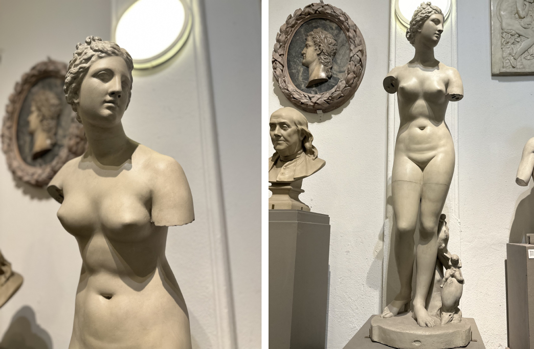 (Left) Venus de Medici in Cast Hall, 2024. Photo by Kristin Geiger-Rayca. (Right) Thomas Pollock Anshutz,[Figure study: male standing, back view] recto; [Cast drawing: Venus, front view] verso, 1850-1912. Charcoal on white laid paper, 24 1/4 x 18 1/2 in. (61.595 x 46.99 cm.). Gift of Mrs. Edward R. Anshutz, 1971.8.76a&b.