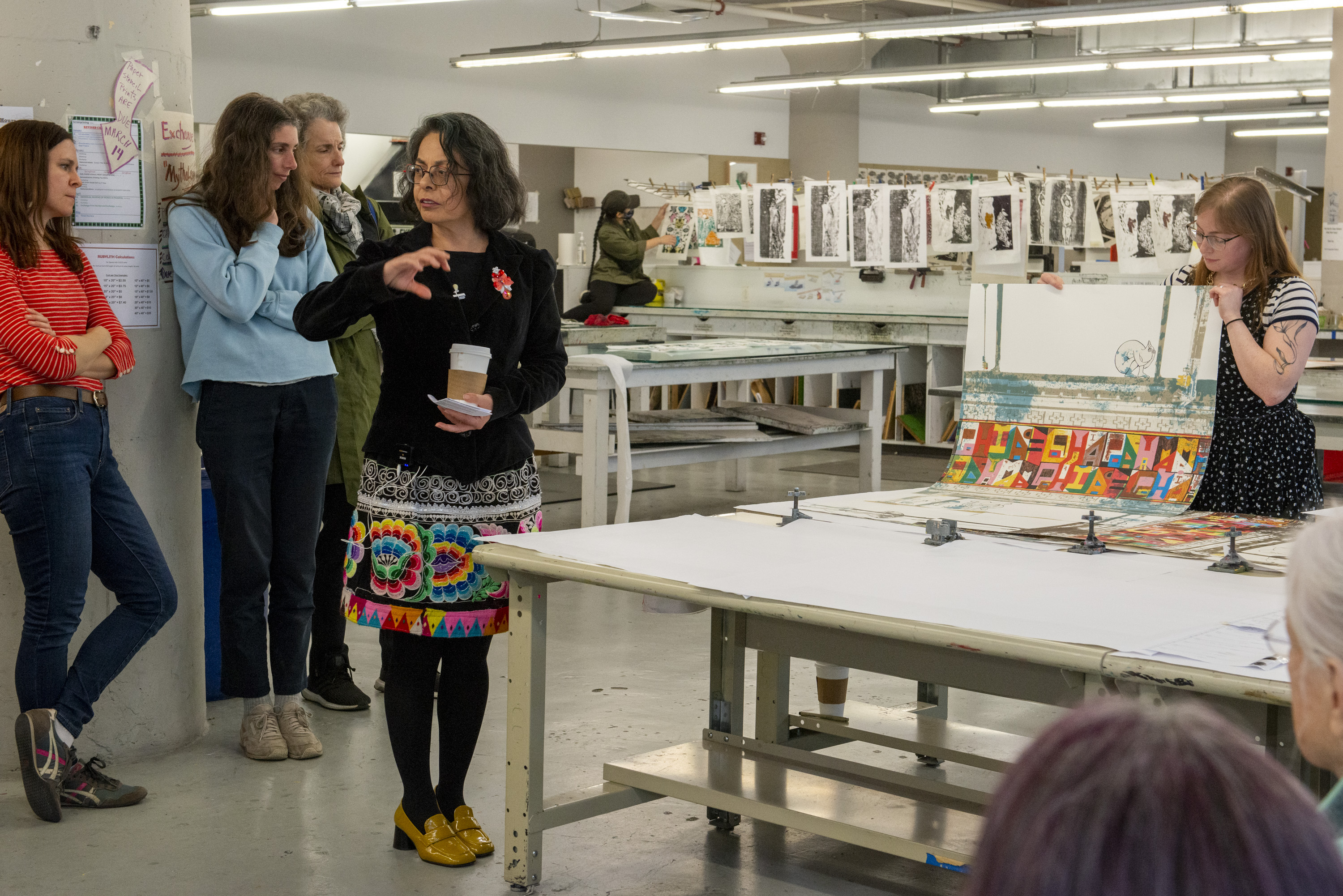 In April 2024, artist Kukuli Velarde joined printer Justine Ditto for an engaging conversation about the creation of Philadelphia Pachamama, a vibrant eleven-color lithograph published by the Brodsky Center at PAFA. Attendees were given a behind-the-scenes look at the intricate lithographic process and learned step-by-step how this complex print was brought to life.