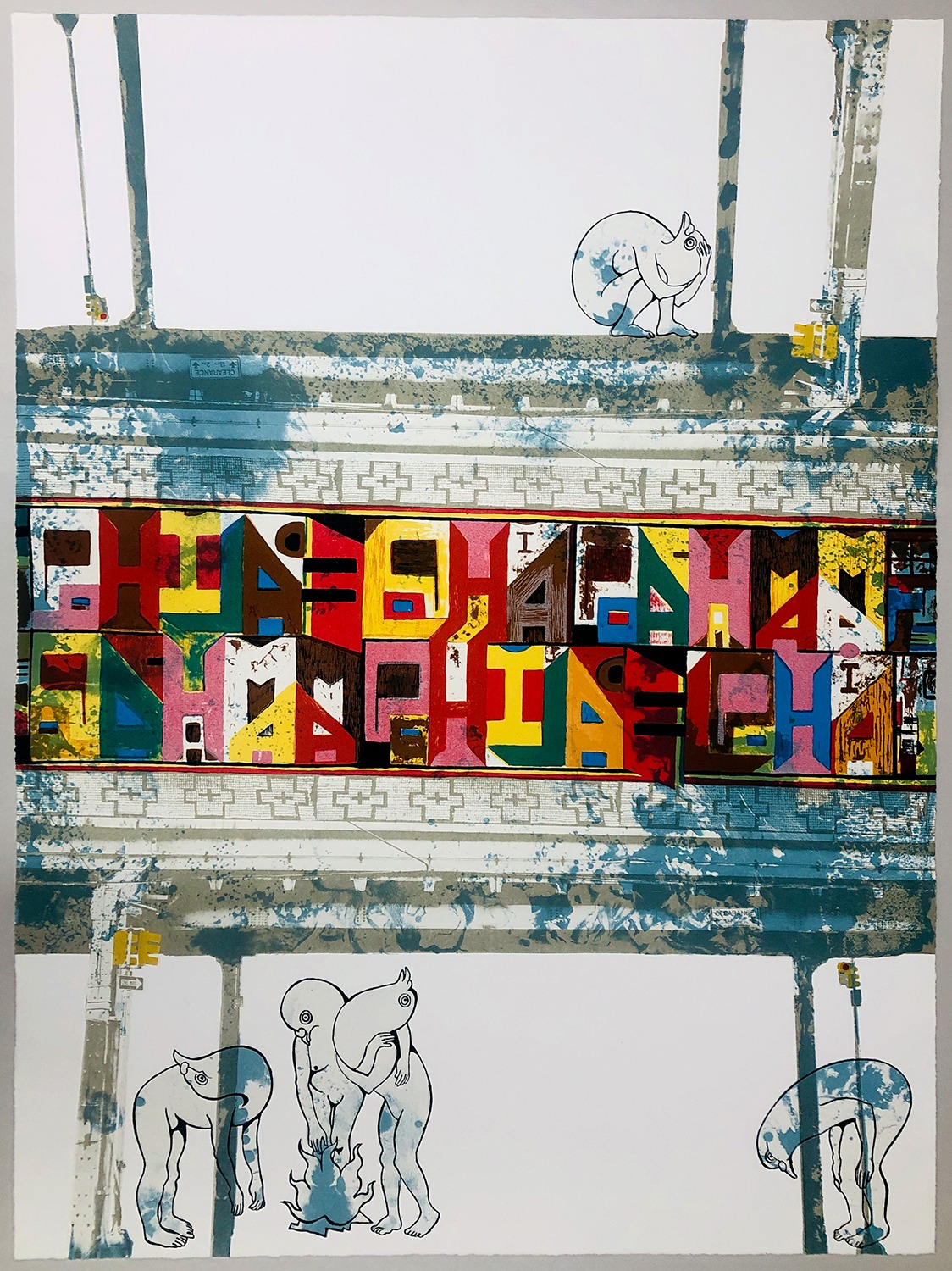 Kukuli Velarde (American, born Peru 1962), Philadelphia Pachamama, 2024, 11-color lithograph on paper, 38 x 28 inches, Edition of 10. Published by the Brodsky Center at PAFA, Philadelphia.