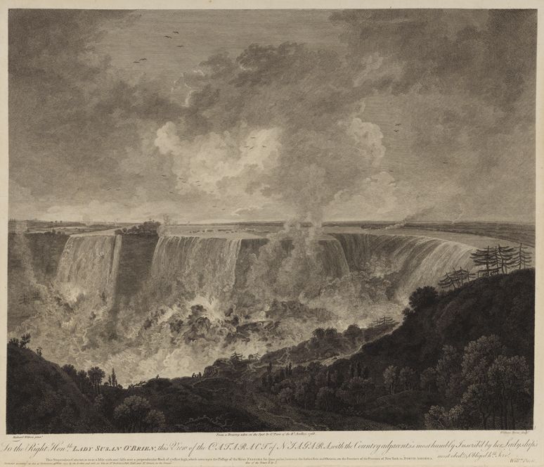 Alongside the Birch painting is Cataract of Niagara by William Byrne. The print is based on a military drawing from the 1760s by Lt. William Pierie. At that time Fort Niagara was a central location of the wars between the French and the English and Iroquois League of Nations in the period before the American Revolution.